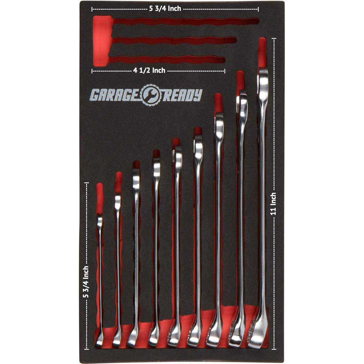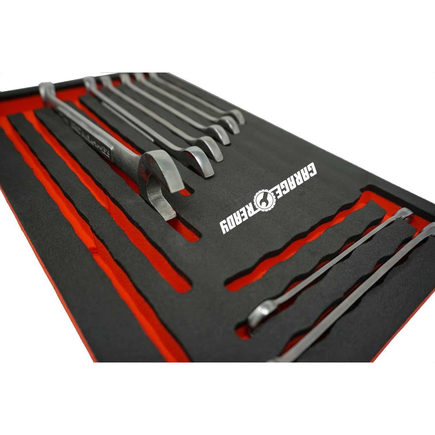 Tool Trays by Garage Ready. Details:The Garage Ready Wrench Organizer is an ideal accessory for your tool box The Garage Ready wrench organizer tray is compact, portable, and fits in most standard tool chest drawers. Stores up to 12 wrenches from 7mm – 1/4″ (lengths as little as 4 inches) to 22mm – 1″ (lengths up to 11 inches). The tool sorter has a unique spring-like storage channel that holds each wrench firmly while isolating each in position from each other. The tray measures 12.75″ x 7.25″ x 1″ and is made of durable high-density foam. This organizer is a vast improvement over other designs and is the best solution for either short or long wrenches. Reviews highlighted the quality of the product and its award-worthy design. This superior organizer provides the ultimate in tool box storage solution and is great for anybody with wrenches scattered in tool chests or boxes. Perfect accessory for your garage.