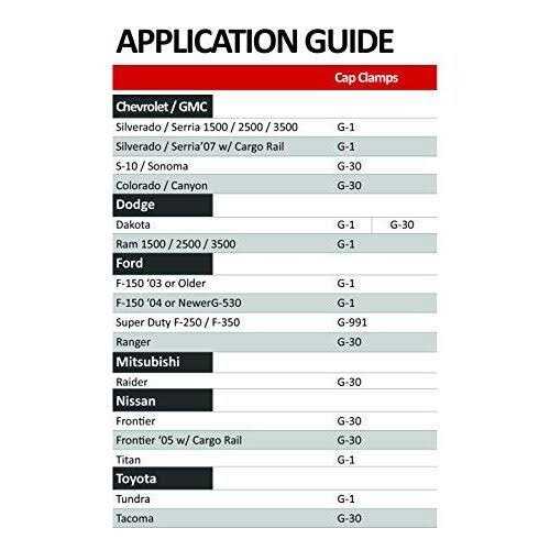 4 Structural Aluminum Clamps Made in the USA Fits the following pickup trucks: CHEVY: Colorado, S-10, Sonoma. FORD: Ranger. GMC: Canyon. NISSAN: Frontier, Frontier ’05 and newer w/Cargo Rail. TOYOTA: Tacoma. NOTE: Use G-1 Clamp to fit: CHEVY: Silverado / Sierra 1500, 2500, 3500. Silverado / Sierra ’07 with Cargo Rail. DODGE: Dakota. Ram 1500, 2500, 3500. FORD: F150. MITSUBISHI: Raider. NISSAN: Titan. TOYOTA: Tundra.NOTE: Use G-991 Clamp to fit Ford Super Duty Trucks.