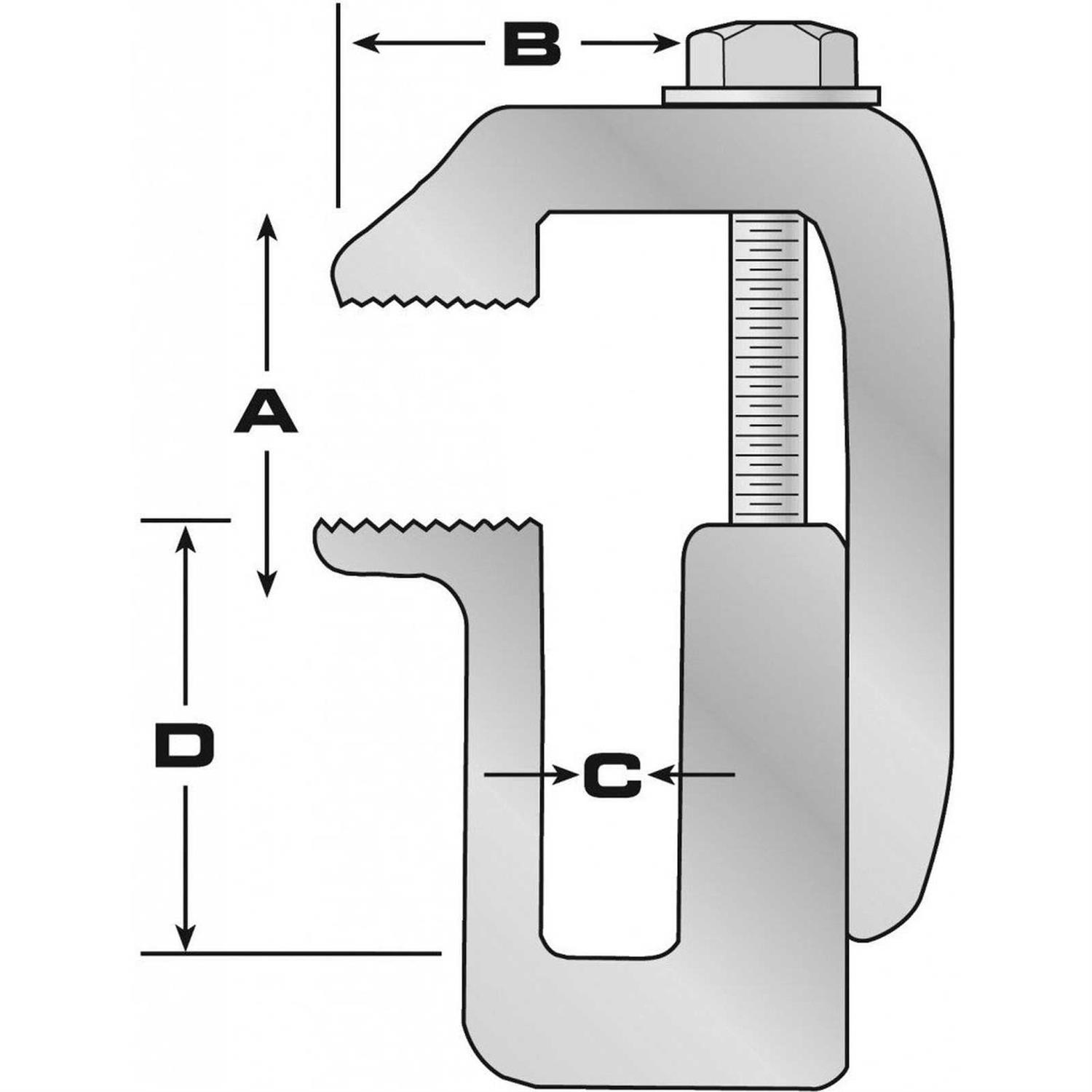 - Dimension A = 0 to 3.8cm Jaw Opening, B = 4.76cm, C = 2.85cm
