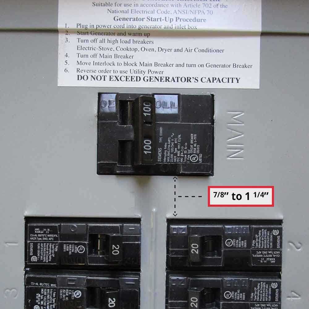 Generator Breaker Interlock compatible with Siemens and Murray 100 amp panels 7/8 to 1 1/4 spacing between main and branch breakers Met lab listed E113887 Kit includes Interlock, labeling, drill bit and generator breaker retainer strap PLEASE Verify panel type by checking all pictures Generator Interlock Kit For Siemens and Murray, 100 amp panels. Spacing between main and generator breaker 7/8 to 1 1/4 inches Met lab listed E113887 Panel and breakers not included
