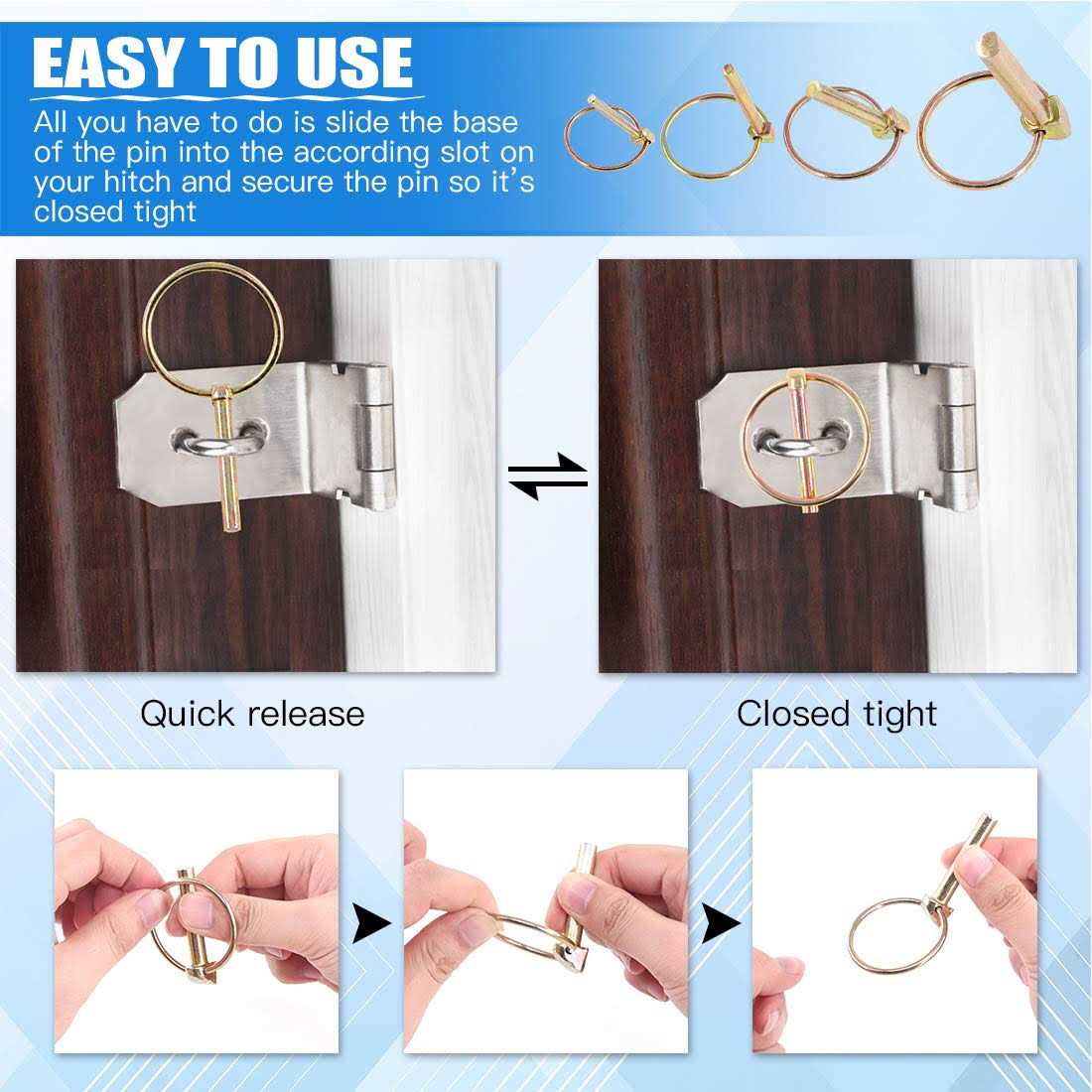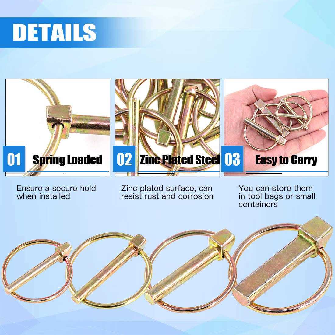 1. Product Type: High quality lynch pin assortment kit 2. Material: Yellow zinc plated, can resist rust and corrosion 3. Product Feature: Lynch pin rings are spring loaded to ensure a secure hold when installed 4. Application: Great for cars, trucks, trailers, ATVs, mowers, tractors and other farm equipment 5. Package Include: 10pc 3/16“x 1-7 / 16”, 10pc 1/4“x 1-3 / 4”, 5pc 5/16“x 1-3 / 4”, 5pc 7/16 “x 1-3 / 4” total 30pcs in a box