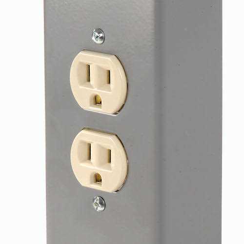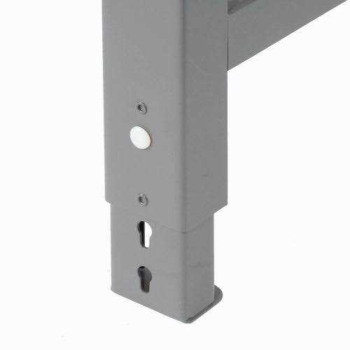A workman’s dream bench. This solid, rugged top stands up to constant, heavy pounding. Hardwood is kiln dried, electronically glued, sanded to 1-1/2″ thickness and has laminated edges. Finished with a penetrating mineral oil for a durable high quality appearance. 96″ L benches include 3 leg frames for stability and reinforcement. Adjustable height legs feature removable duplex knockouts on front and rear for installation of either a hard wired electrical outlet or an optional plug-in outlet that easily screws into place with no wiring necessary. Steel parts are finished with scratch resistant gray powder coat. Bench stringer comes with mounting hardware to assemble legs to the bench top. Leg height adjusts in 1-1/2″ increments.