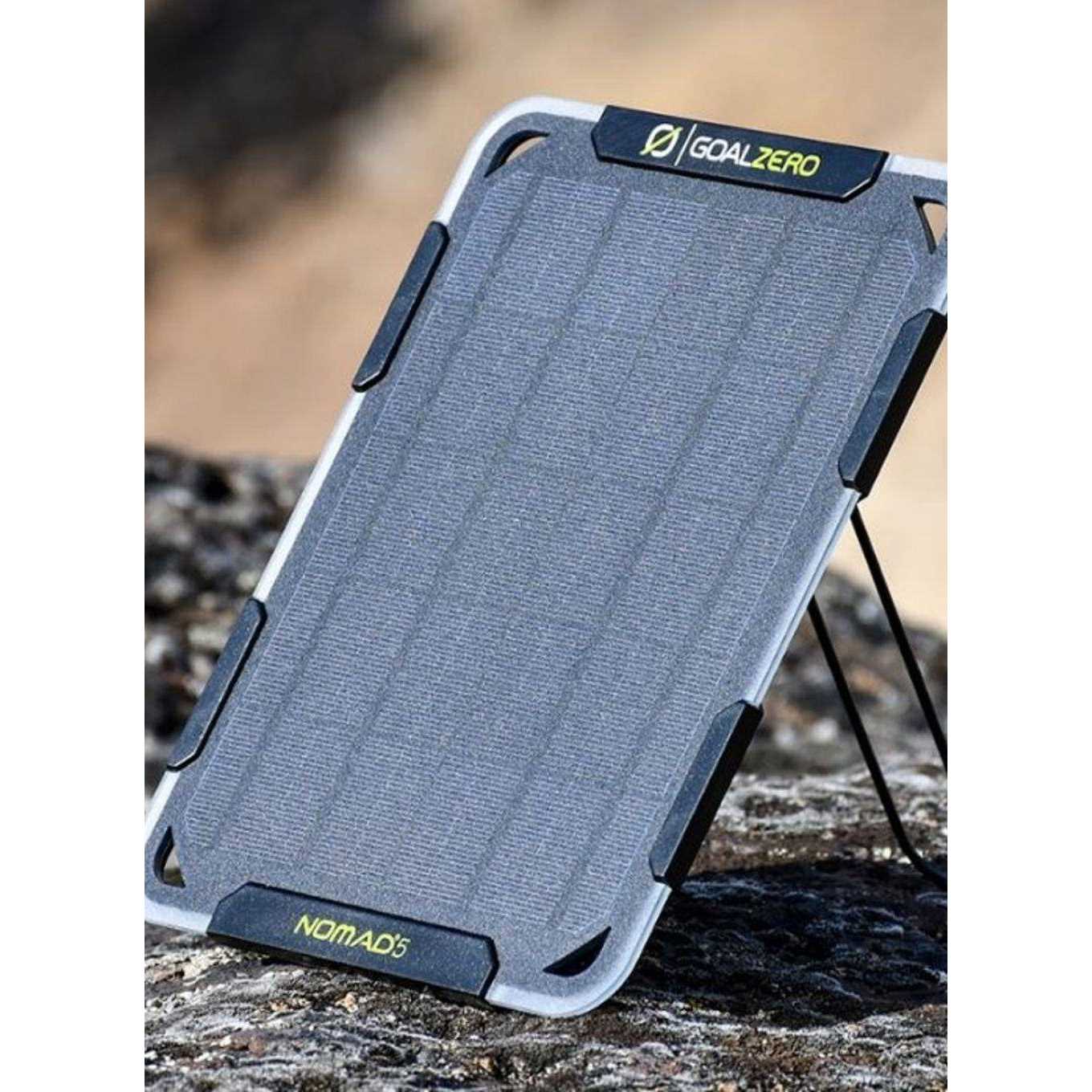 The Goal Zero Nomad 5 Solar Panel is a super-lightweight 5 watt USB solar panel that in combination with a power bank can provide energy for smartphones, action cameras and other USB devices. Thanks to the foldable stand, it is very easy to position, hang or lay down the Nomad 5 in the best way. The solar panel is made from monocrystalline solar cells. This allows the Nomad 5 solar panel to generate 10 – 15 Wh daily, depending on the weather conditions. The panel is robust and developed from durable material. With a weight of only 360 grams, the solar panel is the perfect addition to your outdoor gear.