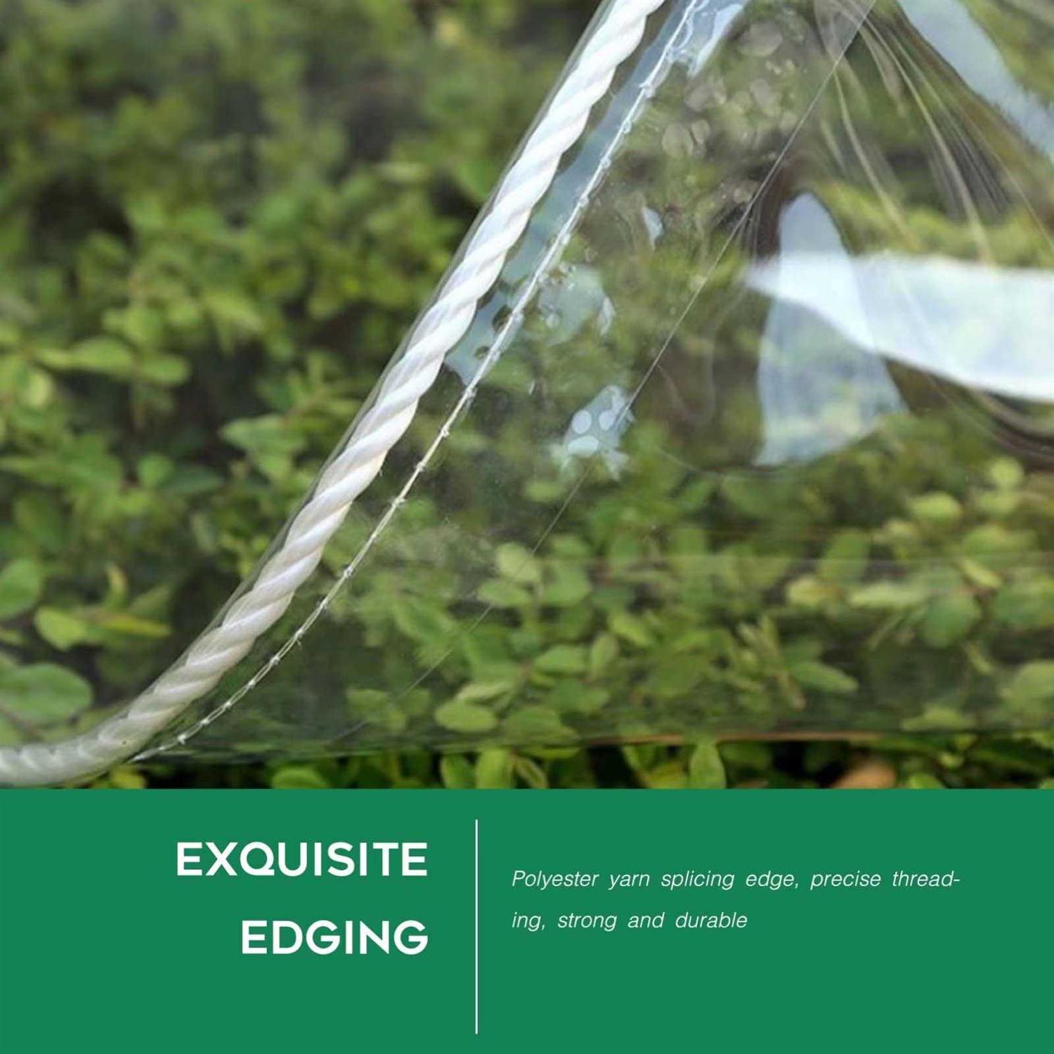 【Attention】:Due to the vacuum packing, there may be wrinkles upon receipt. (warm up with a hair dryer Or iron the wrinkles of the tarp with an ironing machine, because the PVC material will become soft and flat in a warm environment). 【Durable Tarpaulin】: Thickness: 20 mil(0.35mm)Durable Heavy Duty PVC Vinyl, thick material, high temperature heat-sealed double-layer edging, firm, tear-resistant, durable.weight: 400g/m2. 【For quick fixation】:Metal perforations made of high-quality aluminum alloy, The distance between each hole is about 50CM (20in),edge stitches made of polyester fiber, corners with rubber triangular sleeves, reinforced edges;allows easy and quick fastening and securing of the tarpaulin. 【Tarp transparency】: Our glass clear tarp is 99% transparent, which does not block the view or affect photosynthesis.Can be used indoors and outdoors,Suitable for all seasons. 【Tarp edge reinforcement】:Our clear rain tarps have approximately 5 cm of reinforced edges,and improve durability and safety.Due to reinforcement, the product size will have an error of 5-10CM (2-4in), please understand. 【Multipurpose Clear tarp】: The completely transparent tarp can be used as a cover for greenhouses and tents. -Outdoor Clear Tarp Curtain – The clear see through Tarp is perfect as Outdoor curtains which makes everything visible with layer. Ideal for Patio, Porch,Gazebo, etc. -Cover – Perfect for covering cars, trailers, boats, shelters, wood, furniture and garden pools. Also suitable for domestic and professional use, e.g. during construction and renovation works. p Package includes – 1 X fixing rope – Purchase advice – 1. Due to the vacuum packing, there may be wrinkles upon receipt. Wrinkle problem is quickly solved, (warm up with a hair dryer or iron the wrinkles of the tarp with an ironing machine, because the PVC material will become soft and flat in a warm environment). – 2. It cannot be avoided that you receive the tarpaulin with some smells from the original material. The odor disappears when the tarpaulin is circulated in the open air for 2 to 5 days. – 3. Seams are present if product is received over 6ft in length or width. – 4. The real product of the tarpaulin received will have an error of 0.16-0.32ft. (The tarpaulin will lose 0.14-0.30ft of material because the edges of the tarpaulin are reinforced during the production process) /p