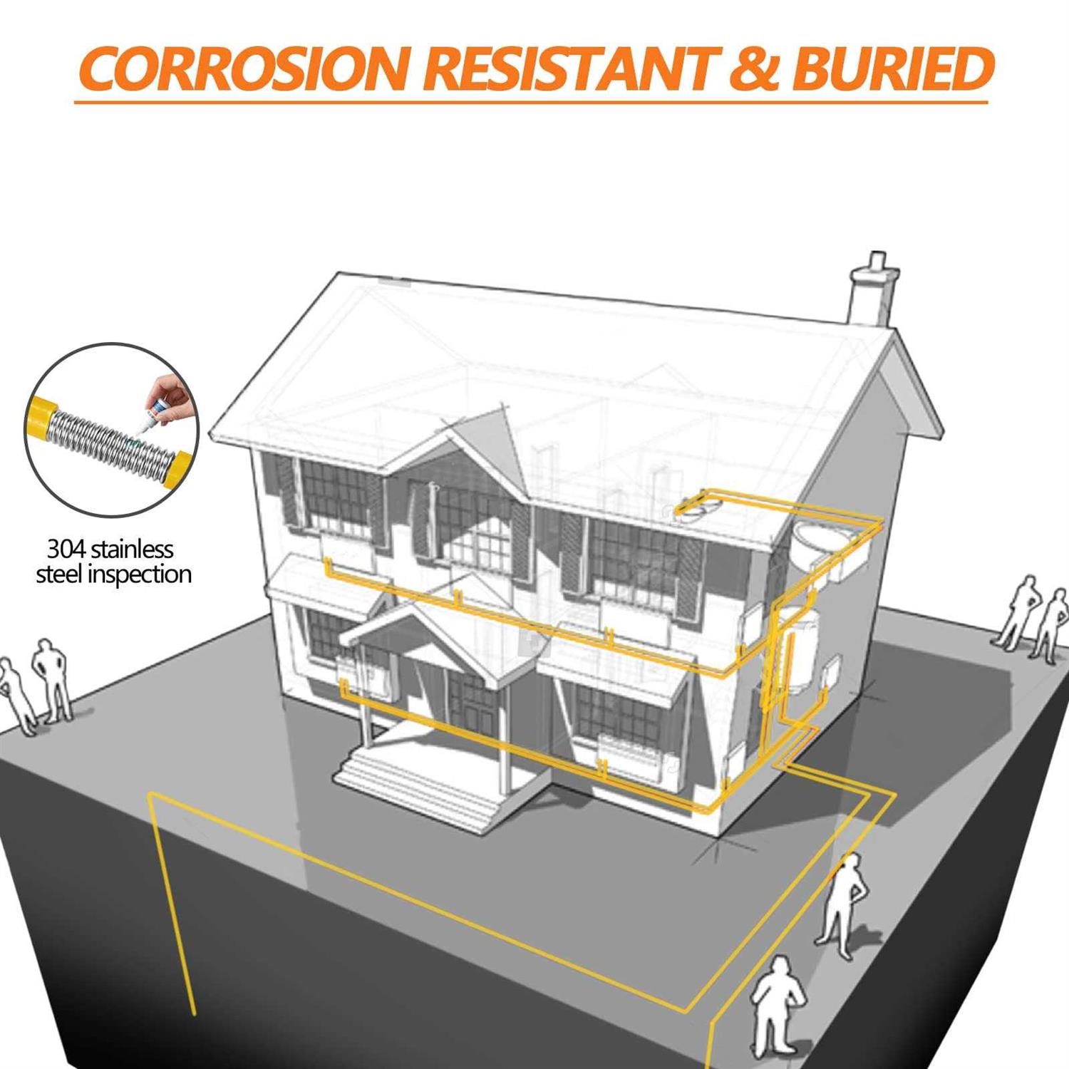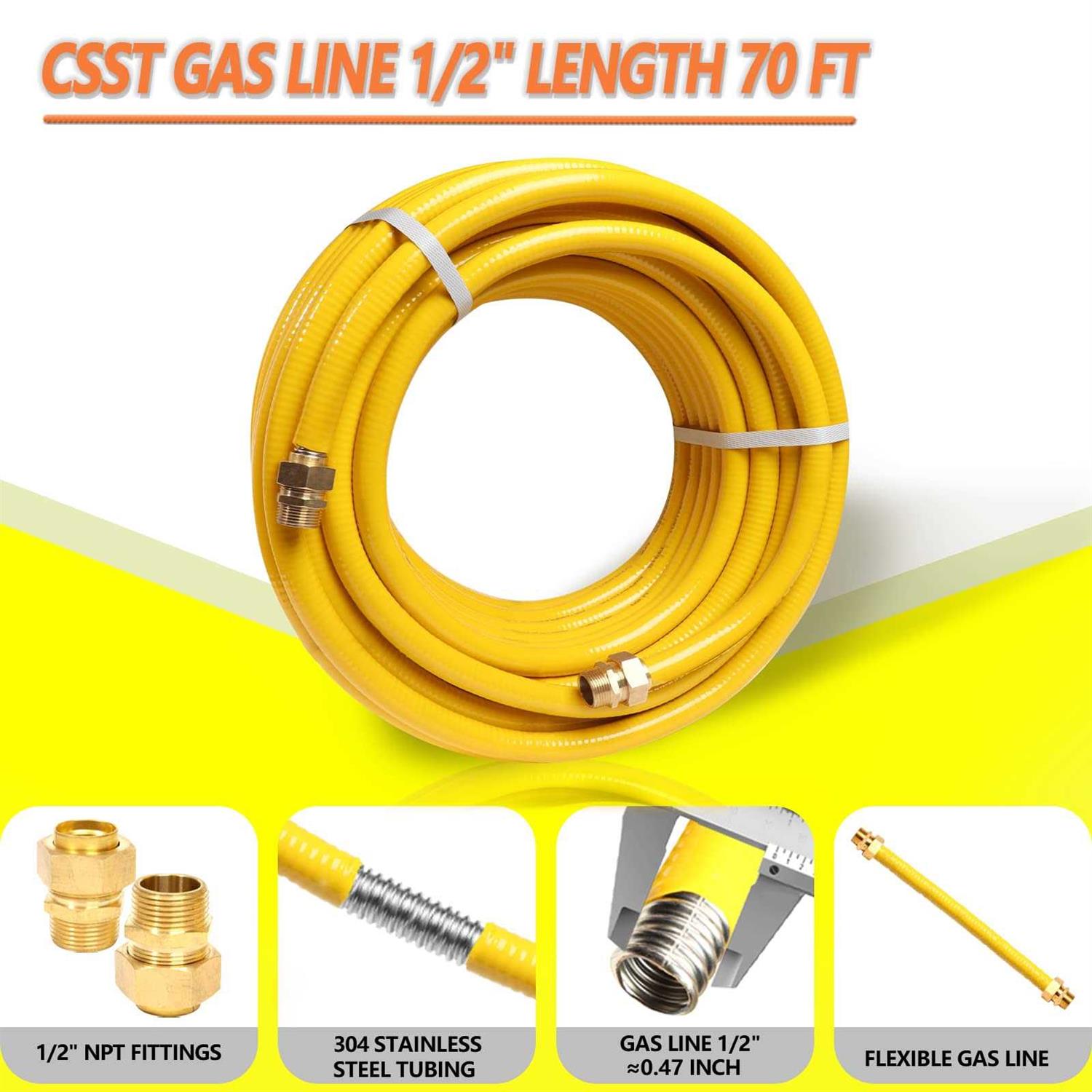 「STURDY CONSTRUCTION」- 70FT length 1/2″ gas pipe size: 0.47″ inner diameter x 0.63″outer diameter, so Our natural gas hose can provide up to 150,000 BTU/hour of Flow Capacity, and provide sufficient airflow for larger sizes equipment to meet your more needs. 「FLEXIBLE AND SAFETY」- Corrugated Stainless Steel Tubing is flexible and can be cut into any length you need,easily snakes into attic and basements areas, around corners and bends, Using one-piece molding exquisite Craft, There is no interface in the middle of the pipe body, reducing the connection point and preventing gas leakage.Really convenient and 100% safety. 「CORROSION RESISTANT & BURIED」- The inside of the flexible gas line is stainless steel SUS304 corrosion-resistant material, the surface layer is 0.079inch UV-resistant yellow polyethylene jacket.The gas pipe should never be buried directly underground without a conduit. To route tubing underground, it must be protected within a non-metallic water-tight conduit that is at least ½” larger than the outer diameter of the CSST tubing. 「WIDELY APPLICATION」- Natural gas grill hose works perfectly, easy to install, durable and very fast. For use with natural gas, liquid propane applications, propane fire pit, natural gas fire pit, gas range, water heater. Please pay attention to the pipe size when calculating the pressure loss. Please ensure correct installation before use to prevent air leakage.