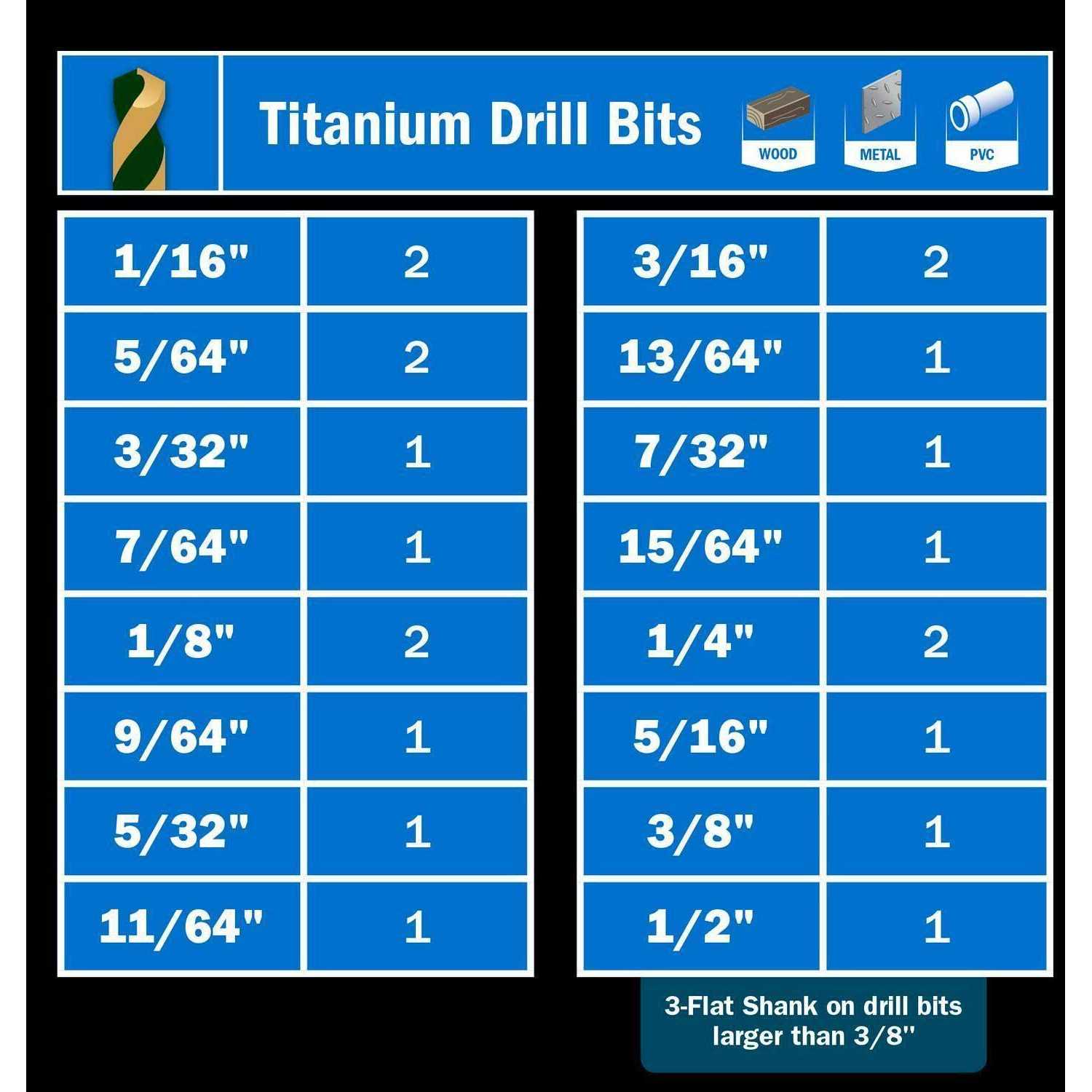 The 135 Split Point Tip prevents bit from walking for an easier start and provides up to 4X faster* drilling. The titanium coating helps reduce friction providing longer life for the bit. Set includes a variety of sizes ranging from 1/16 to 1/2with a convenient case. Bits are designed for use in a drill/driver.