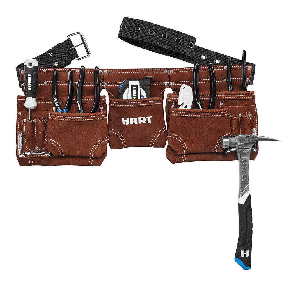 The HART Tool Belt is the perfect addition to any professional or DIYers tool collection. Whether you are a weekend warrior putting up a new fence or a professional on a job site, this tool belt is an excellent accessory to ensure the tools and supplies you need are right where you need them when you need them. The HART tool belt is made of a durable suede leather and features double stitching along the pockets for maximum durability. This tool belt has 11 pockets to provide superior storage capability for any project. The versatile metal hammer holders allow for storage of up to two hammers. The heavy-duty nylon belt features a webbed design along with metal grommets for increased durability and longevity with the capability to accommodate up to a 54-inch waist. This belt contains all of these features while maintaining a low weight of 1.85 pounds to increase comfort while decreasing user fatigue.