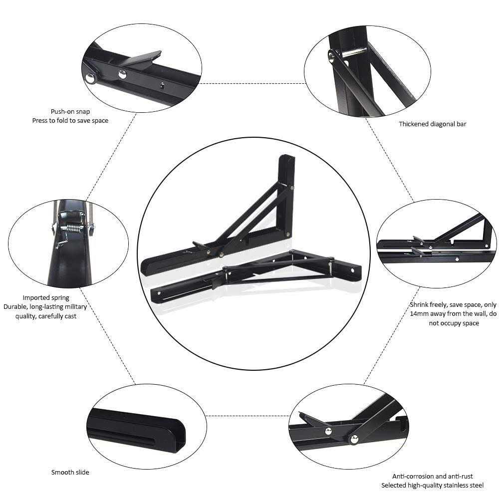【Stable and sturdy】The heavy-duty folding bracket is made of high-quality steel and advanced painting technology, with excellent craftsmanship, no sharp edges, corrosion resistant, and not easy to rust. The simple appearance design can be combined with different decorative styles. 【Strong load-bearing capacity】 The folding bracket uses thickened and widened support rods to improve durability and hardness, and a stable triangular structure, the installation can be more solid and stable and can load up to 110lb. 【Space-saving】 Can be easily installed on any wall without damaging the wall. The folding table hinge locks in at an angle of 90 degrees. When not in use, simply press the spring button, and then it can be easily folded in. Super space-saving and easy to use. 【Wide applications】 Black folding console can be easily pulled up and folded in, ideal for mounting desks, wall tables, camping tables, tabletops, shelves, wall folding tables for balconies, kitchens, mobile homes, shops, workshops, bathrooms, etc. The frame is made of a 90 ° triangle, it is space-saving and provides great strength and strong supporting force. br Convenient storage: can be folded and pulled up easily. br Material: Cold Rolled Steel br Color: Black br Size: 8, 12, 16 inch br Load Capacity:110lb br Adjustable/Foldable: Yes br Package Includes: br 2 x Triangular folding brackets with matching screws br Wall Shelf Brackets br Installation: br 1. Place the folding bracket on the wooden board and use it to align the holes. 2. Tighten the screws with a screwdriver. br 3. Repeatedly adjust the position on the vertical surface until it is level and mark it. br 4. Use an electric drill to drill a small hole at the mark. br 5. Insert the anchor into the hole and hit the wall with a hammer. br 6. Use a Phillips screwdriver to align the holes and tighten the screws. br 7. When not in use, it can be folded up and does not take up any space. br Note: br 1. Due to the different monitor and light effects, the actual color of the item might be slightly different from the color shown in the pictures. br 2. Please allow a 1-2cm measuring deviation due to manual measurement br