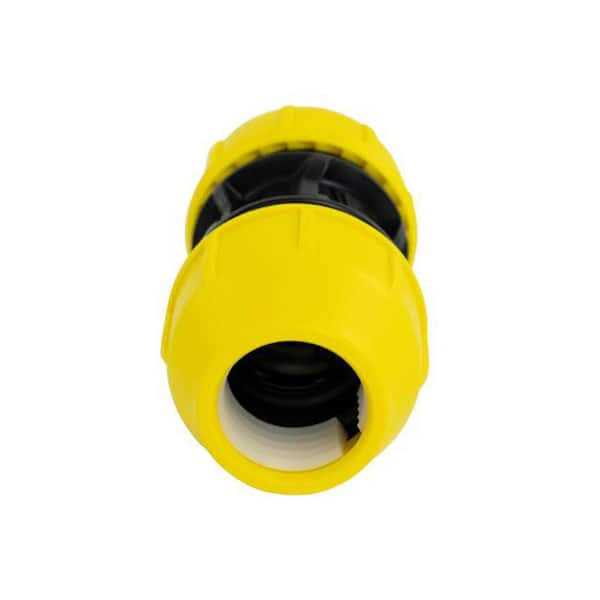Pipe Coupler allows you to safely and easily connect two pieces of polyethylene gas piping. Simply cut the pipe slide in the provided stiffener and slide into the fitting and tighten down. Color: Yellow.