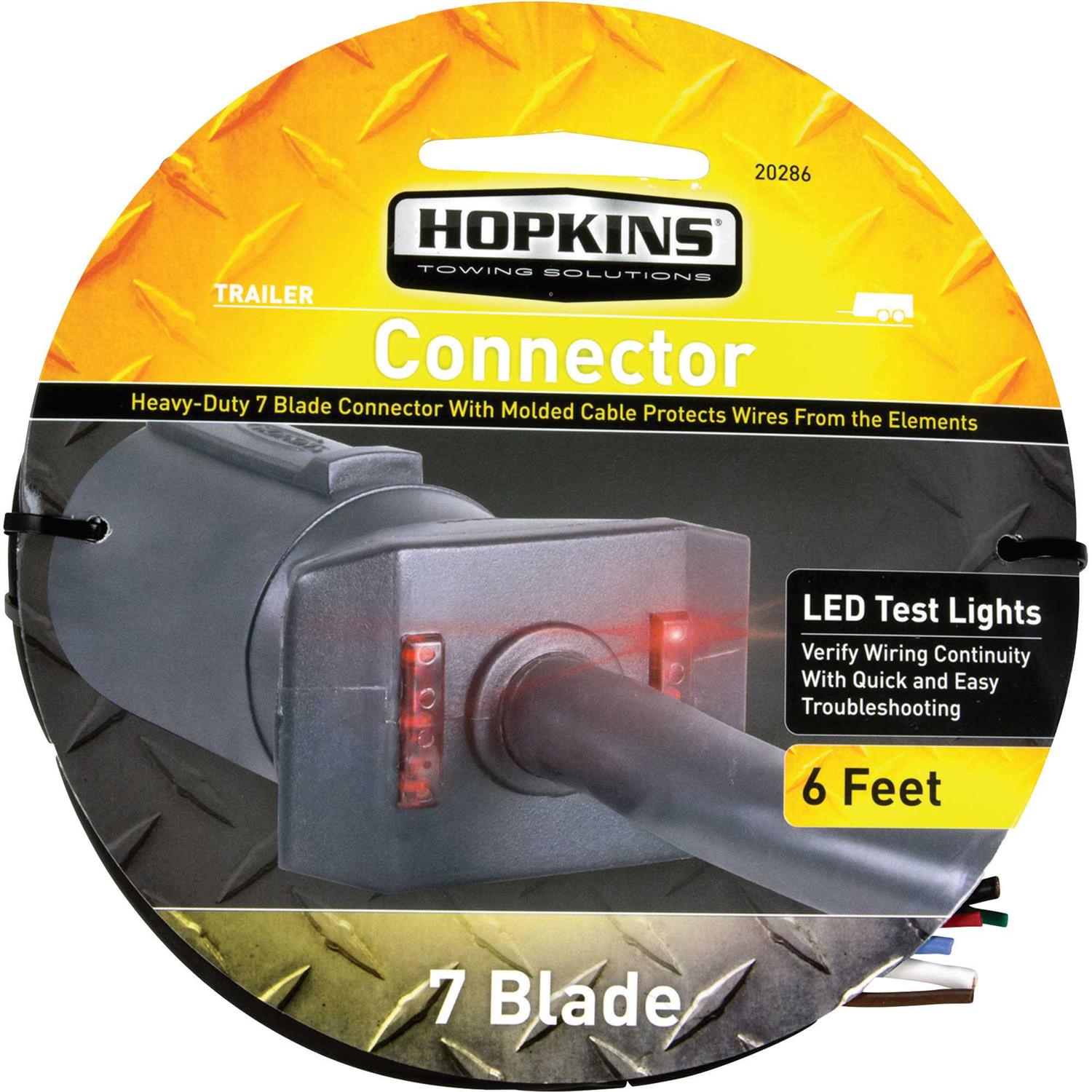 Ensure proper connectivity and tow safely with Hopkins LED Test 7 Blade Molded Cable. With our patent pending design, at a glance one can easily detect whether or not the vehicle and connection to the trailer are working properly. Let us isolate the problem for you so you can save precious time and get on the road quicker. LED lights imbedded into the connector test each electrical function. If any of the LED lights are illuminated, focus your efforts downstream on the connection of that specific function. Each wire is heavily insulated with jacketed wire protection, making this molded cable impact and corrosion resistant. Hopkins Towing Solutions makes your towing experience simpler and more rewarding through innovation and value. Hopkins offers a variety of towing solutions including vehicle wiring kits, adapters, vehicle and trailer connectors, breakaway systems and much more.