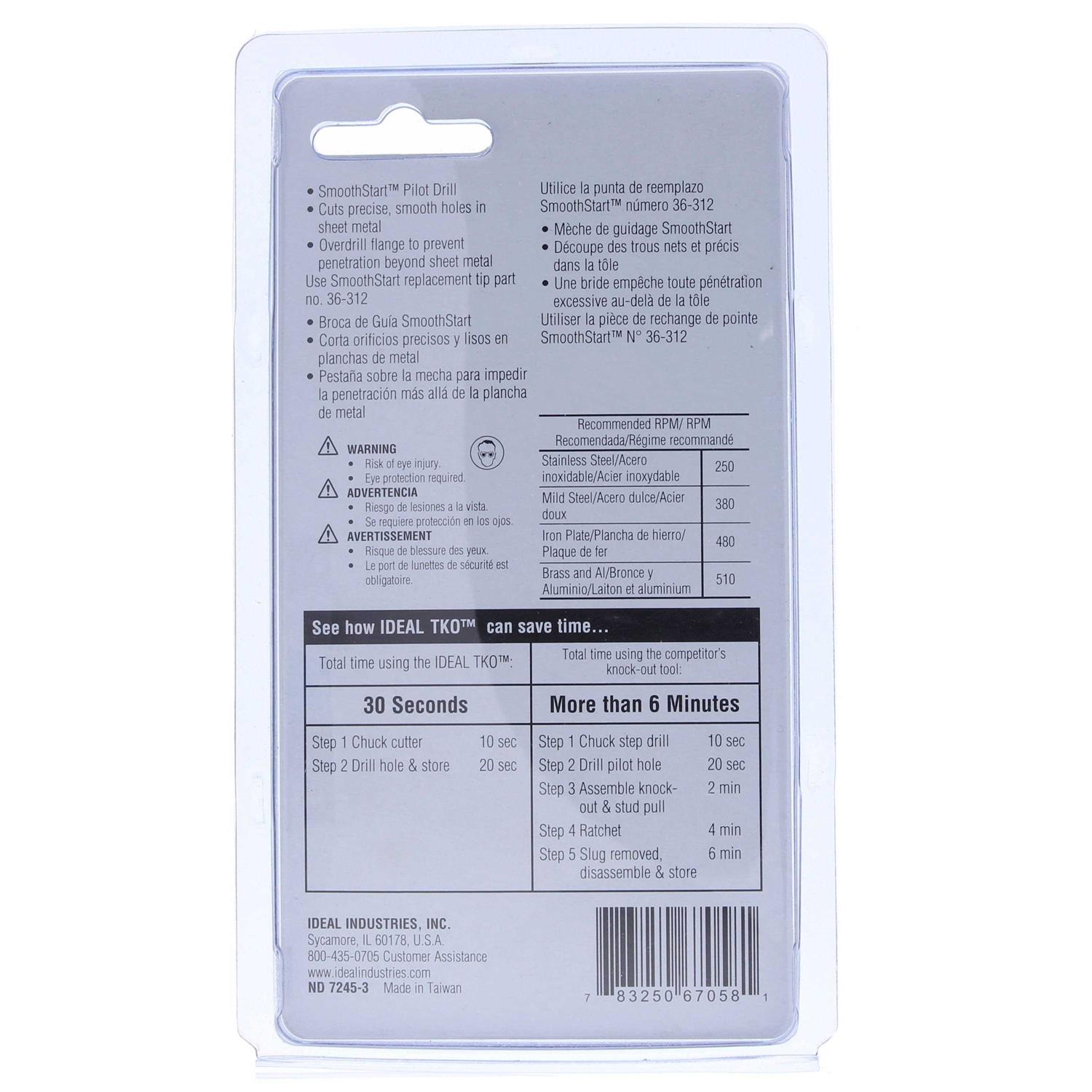 SmoothStart pilot drill prevents carbide damage by gradually guiding cutter to material Precision ground carbide teeth for fast cutting of clean round holes Designed specifically for sheet metal cutting even stainless steel Over drill flange built in to prevent penetration beyond the sheet metal The IDEAL 36-301 TKO Carbide Tipped Hole Cutter 7/8-Inch prevents carbide damage by gradually guiding the cutter to the material with the Smooth Start pilot drill. It has precision ground carbide teeth used for fast cutting of clean round holes. It is designed specifically for sheet metal cutting even stainless steel. There is an over dill flange built in to prevent penetration beyond the sheet metal. In 1916 J. Walter Becker started the Ideal Commutator Dresser Company of Chicago from his mother’s kitchen. He manufactured commutator dresser stones with the belief that every product should be worth more than the price paid for it. Service he said was part of the product. That idea has been the core IDEAL business principle for over 90 years.