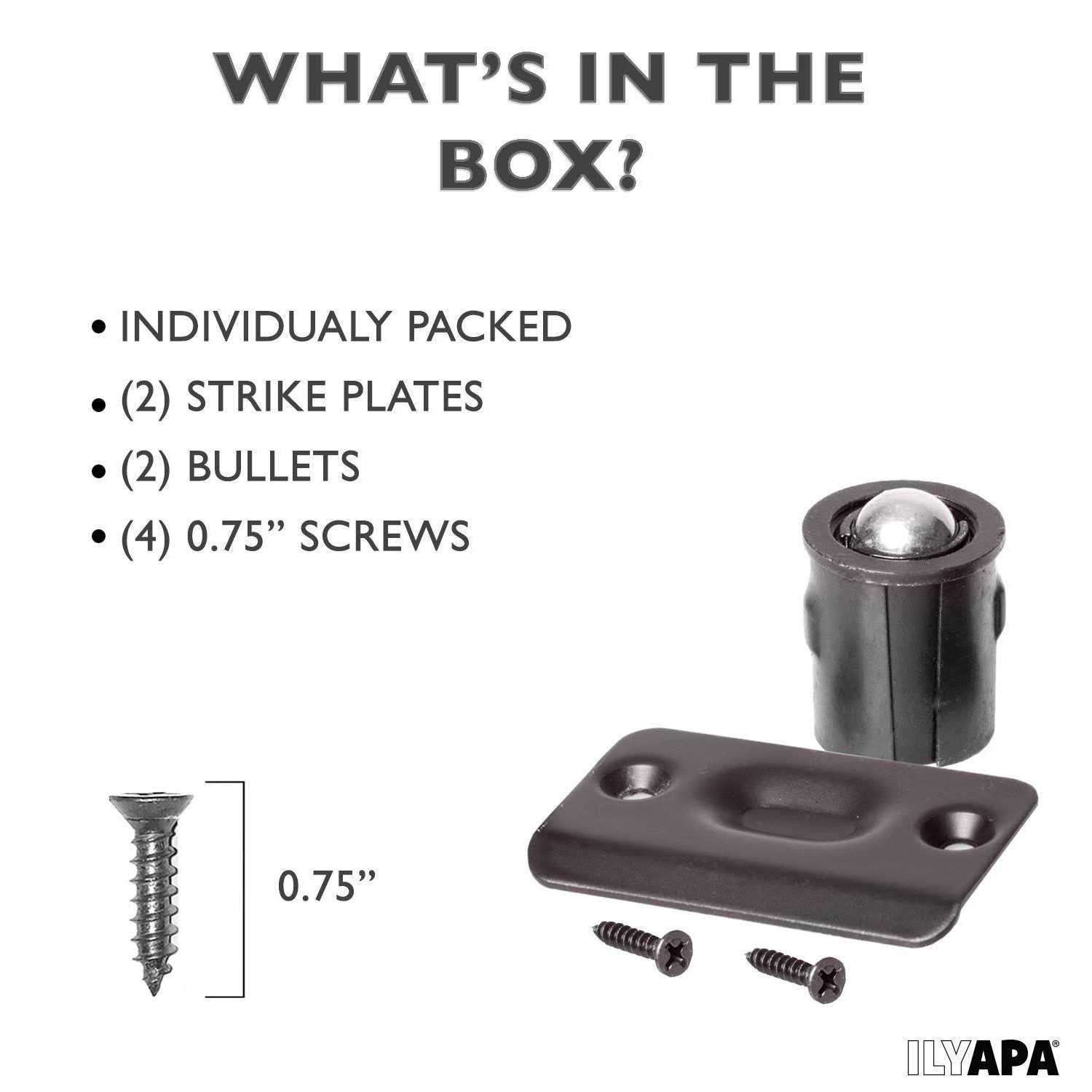 DOORS OPEN & CLOSE SMOOTHLY – This Closet Door Ball Catch Pack uses an all metal spring and ball mechanism to ensure smooth opening and closing of closet and other interior doors. STRONG DURABLE DESIGN – Made with heavy duty steel and a durable design, this closet door hardware set is built to last! FREE MOUNTING SCREWS included for quick and easy installation! 2.25 x 1.38 inch strike plate. 1.38 x 0.88 inch bullet. 0.75 inch screws. INDIVIDUALLY WRAPPED to protect against scratches. Perfect for closets, cabinets, drawers and more! DOORS OPEN AND CLOSE SMOOTHLY – This Oil Rubbed Bronze Ball Catch Door Hardware uses an all metal spring and ball mechanism to ensure smooth opening and closing of closet and other interior doors. EASY TO INSTALL – Quick and easy installation! STRONG DURABLE DESIGN – All metal construction means these are made to last. GREAT DEAL – Quality, durable hardware for less money!