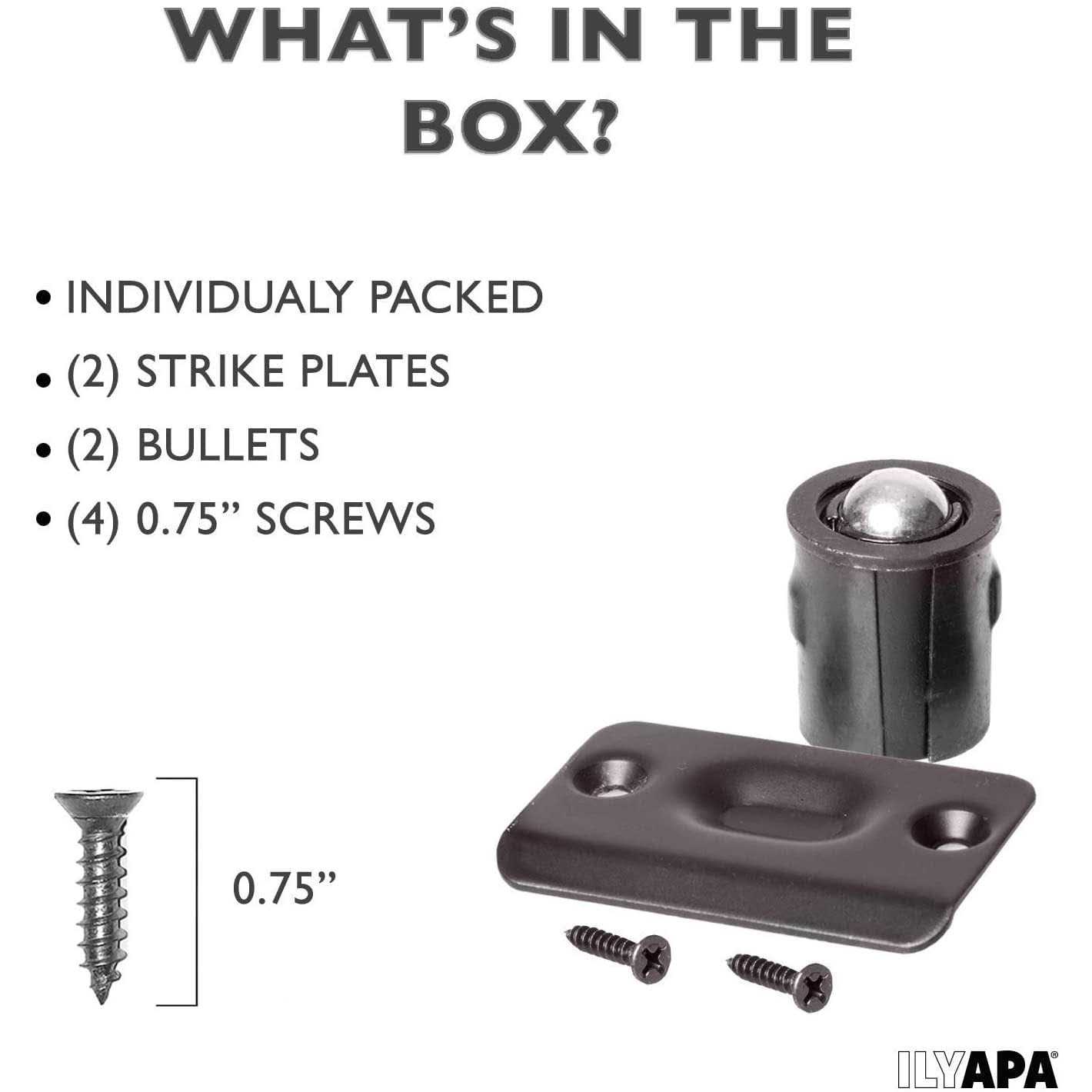 DOORS OPEN AND CLOSE SMOOTHLY – This Black Ball Catch Door Hardware uses an all metal spring and ball mechanism to ensure smooth opening and closing of closet and other interior doors. EASY TO INSTALL – Quick and easy installation! STRONG DURABLE DESIGN – All metal construction means these are made to last. GREAT DEAL – Quality, durable hardware for less money! Tough Durable Design Our heavy duty Ball Catch Door Hardware is built to last. All metal stainless steel and bronze construction means quality hardware that will last. Protect Your Wall & Door This Ball Catch Door Hardware will ensure smooth opening and closing of interior doors.. Quick, Easy Installation Installation is quick and easy. You’ll have your ball catch door hardware installed in minutes. Click “Add to Cart” and order today!