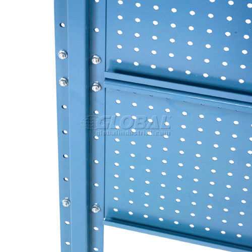 Industrial Workbench, Plastic Laminate Square Edge Blue 60″W x 30″D Industrial Adjustable Height Workbench is made of all-welded steel for long lasting durability and strength. Open leg workbench features 3″ wide 13 gauge channel formed steel legs with adjustable height from 29-1/2 to 34-1/2″ high on 1″ increments. Features a 15″ deep shelf below bench top for convenient storage. 1-1/2″ thick top with side to side steel reinforcement and 3000 lb. capacity provides strong, sturdy work surface. Bench top constructed of Plastic Laminate with standard Square Edge. Complete Workbench option includes riser, drawer, lower shelf, 6 outlet surge protector and 30 pc. peg hook kit. Dimensions are 60″W x 30″D. Color is Blue.