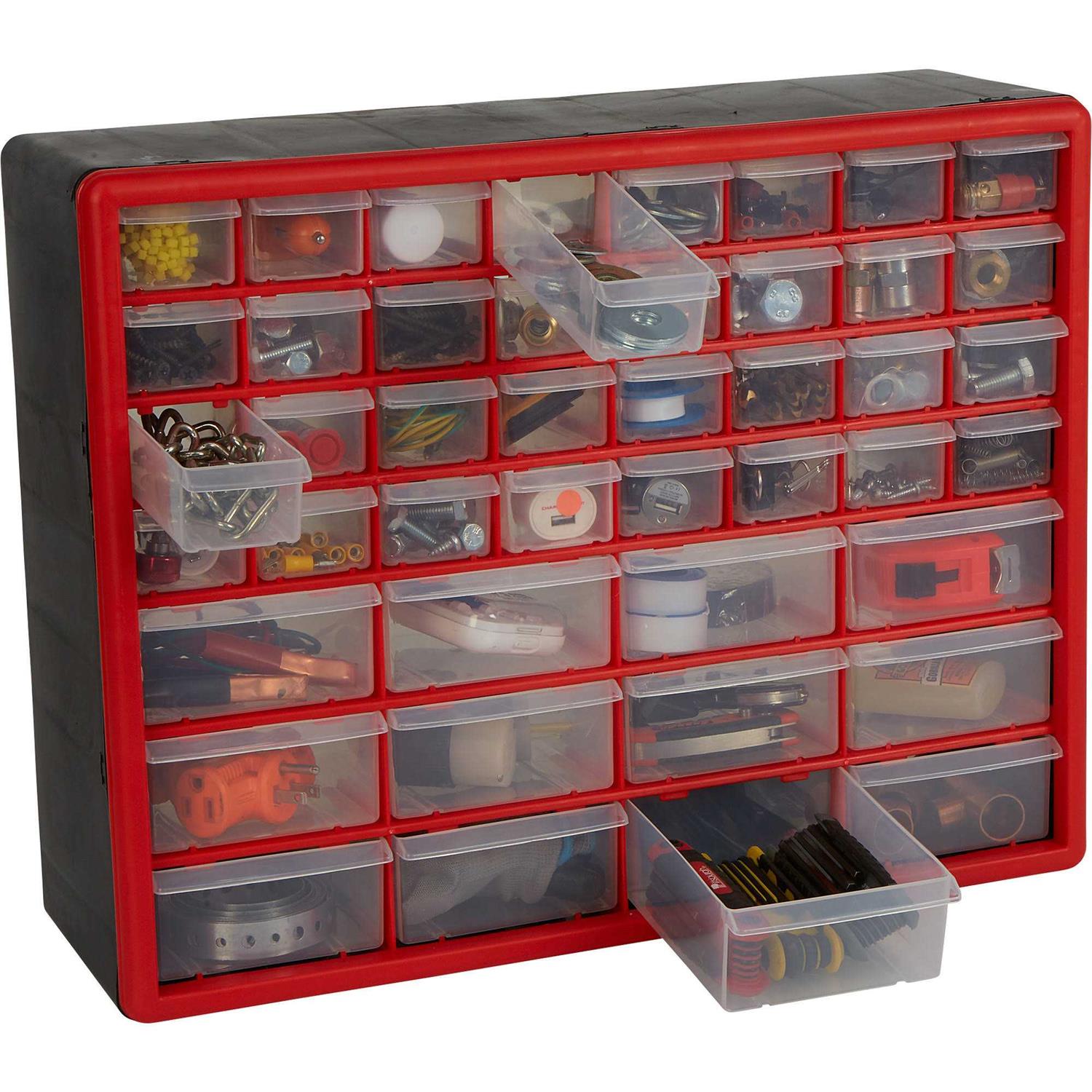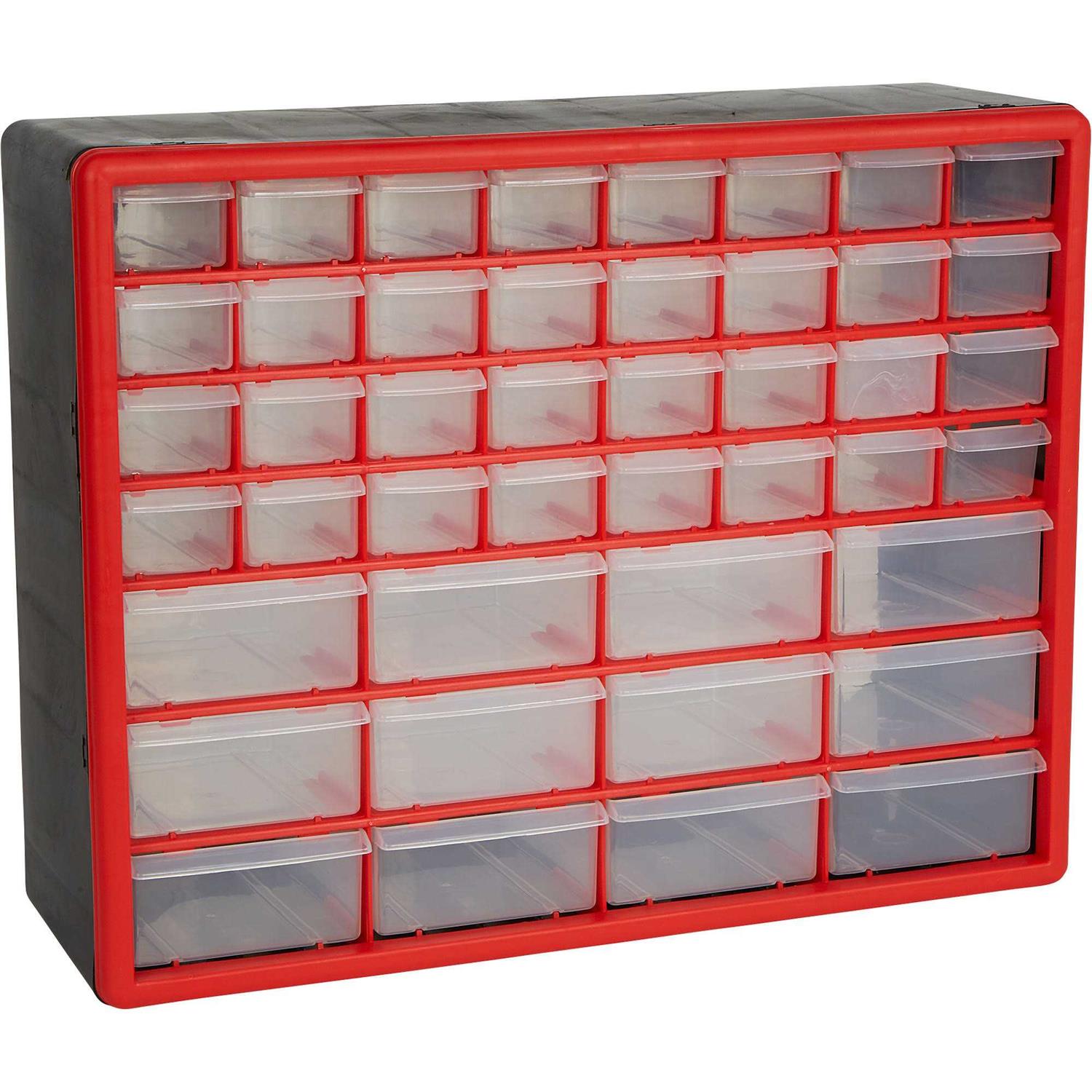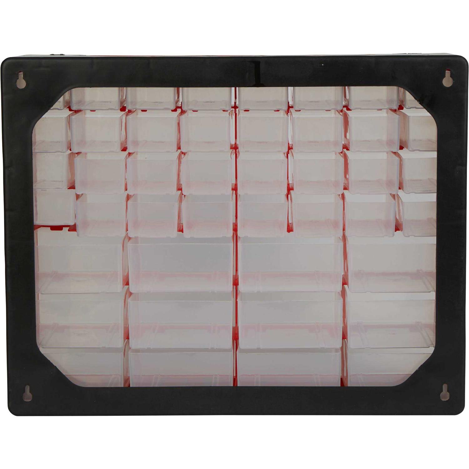 The Ironton 44-Drawer Cabinet is designed with 32 small and 12 large compartments for storing parts, fasteners, small tools and accessories. Made of durable polypropylene, this sturdy organizer can be mounted on the wall or stand on a workbench. Removable transparent bins allow easy viewing of contents. Material: Polypropylene, 44-drawer cabinet is ideal for storing parts, fasteners, small tools and more Removable transparent bins allow quick viewing of contents 32 small and 12 large compartments Mounts on wall or stands on workbench Polypropylene construction 19 3/4in.W x 6 1/4in.D x 15 1/2in.H