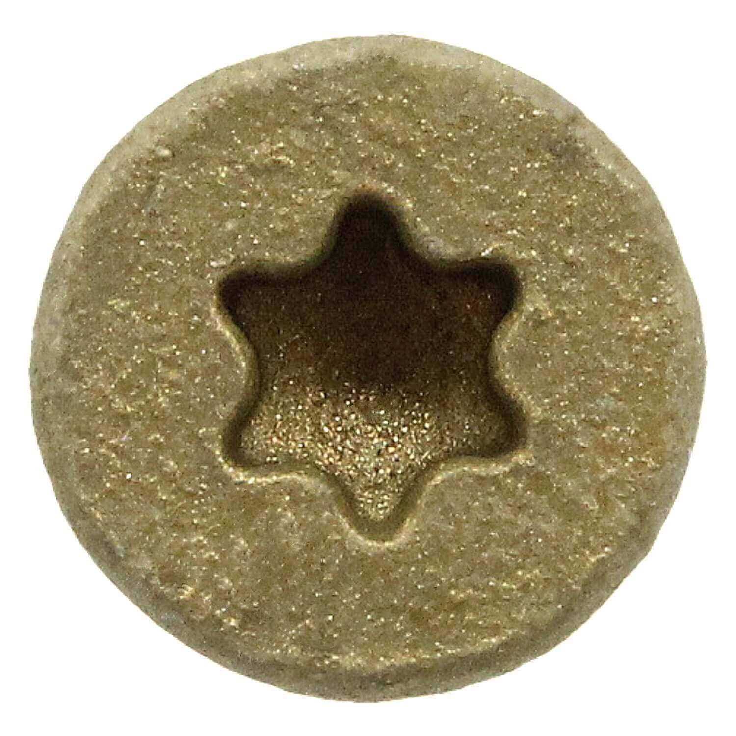 BRONZE STAR WOOD SCREWS These #9 X 1-1/2 Bronze Torx Star Drive exterior coated screws are great for all sorts of projects… good in the barn, building shelves, framing, and more. With the T25 torx drive head you will be able to set these screws with minimum torque and effort. You will be surprised at how easy these wood screws drive. The torx/ star drive head makes them easy to install without straining… you dont have to put so much down pressure like you would with a Phillips head bit. And, as a result, there is less likely a chance of cam out as well. You can use these screws once and leave them where they are… or you can use them to do a job and then take them out and use them again somewhere else. Screw Count is approximate as package is filled by weight. Model # BTX-9112 Features: Exterior use bronze star wood screws T25 Torx Drive head requiring less torque to set the screw. Heat treated, heavy duty! exterior and multiple use screws
