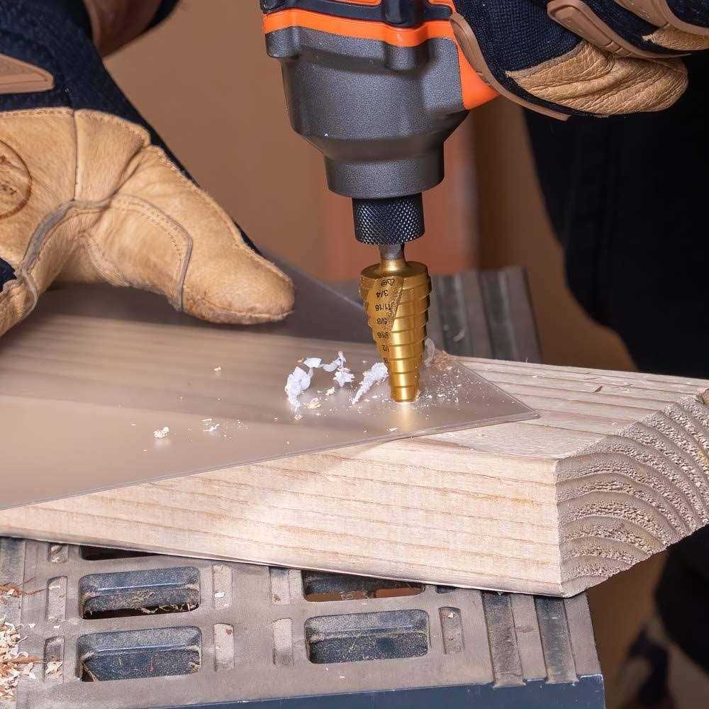 The All-Purpose Step Bit Kit features 4 commonly used step bits, with dual spiral fluting to help pull the step bit through material for faster cutting. Titanium Nitride coating extends the life of the cutting edge. Convenient to use with an impact driver and drill, the 1/4-Inch hex shank provides a firm, positive grip. Kit comes in a rugged case that includes a convenient oil bottle for bit lubrication and longevity.