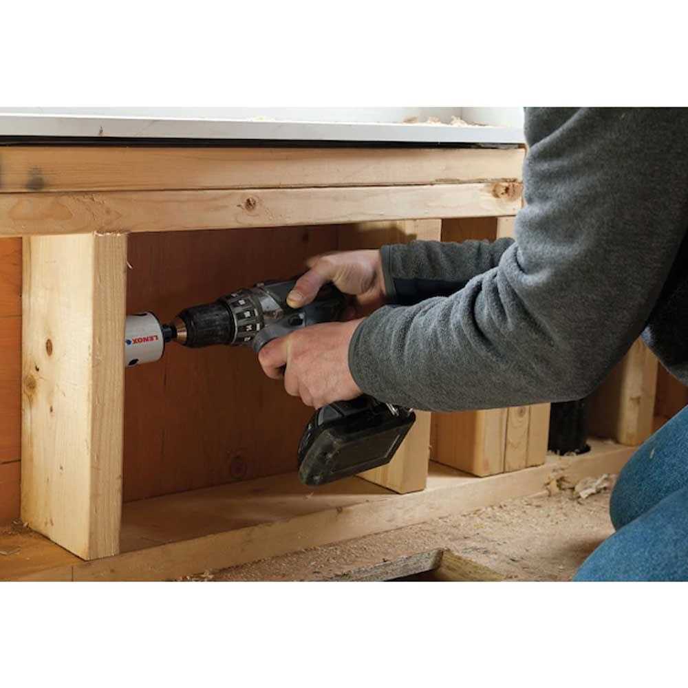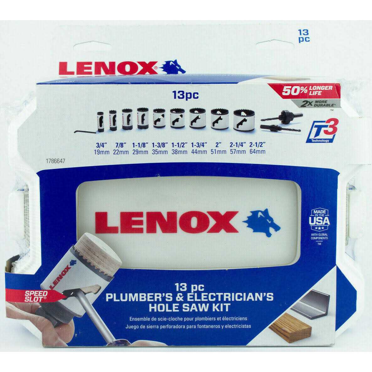 The Lenox Tools Hole Saw Kit with T3, Electricians/Plumbers Kit, 9 piece, features hole saws with enhanced tooth geometry to cut 50% faster than previous Lenox hole saws. Twice as durable as our previous generation when cutting through metal, these bi-metal hole saws feature thicker walls to minimize tooth loss and improve durability. Staircase SPEED SLOTS have wide slots placed low on each hole saw and multiple leverage points to make it easy to work plugs out with a screwdriver. This design effectively removes sawdust and chips and helps prevent plugs from becoming stuck in each saw. 10% taller than previous models, they deliver cleaner cuts through two-by lumber.