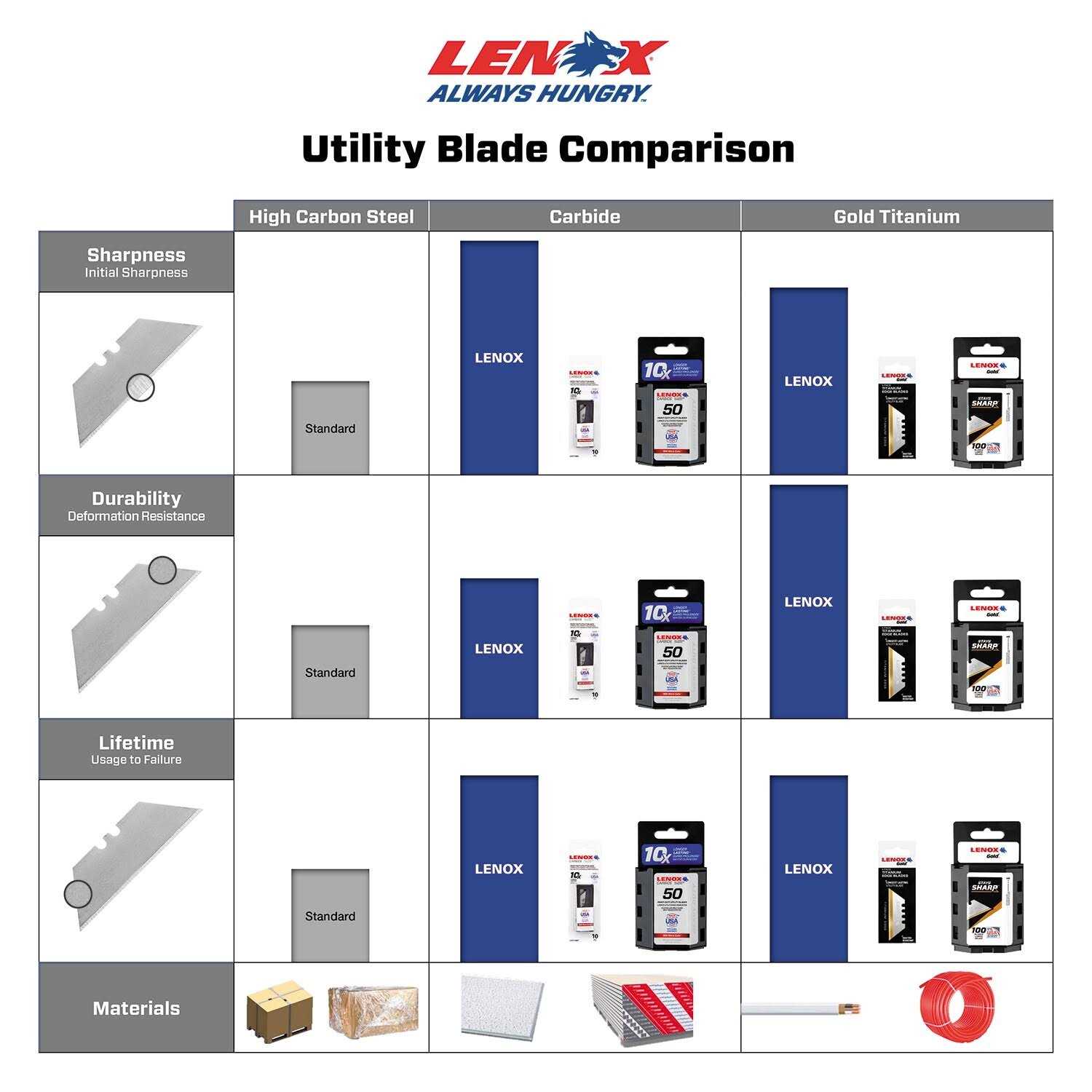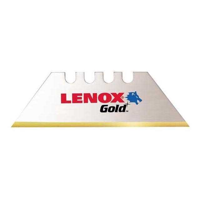 Virtually unbreakable Lenox Edge Bi-Metal utility Blade. Up to three times the life of carbon steel blades. Shatter-resistant. Safer than carbon blades. Fits standard utility knives. 5 Blades per package. The blades have a high speed steel edge with titanium coating that keep the blades cutting after others have quit. The patented bi-metal construction allows the blades to bend and flex without breaking. The four notch system allows the blade to extend further. The Lenox Gold Titanium Edge Utility Blades fit all standard utility knives and are great for cutting drywall, insulation, flooring, roofing and more.