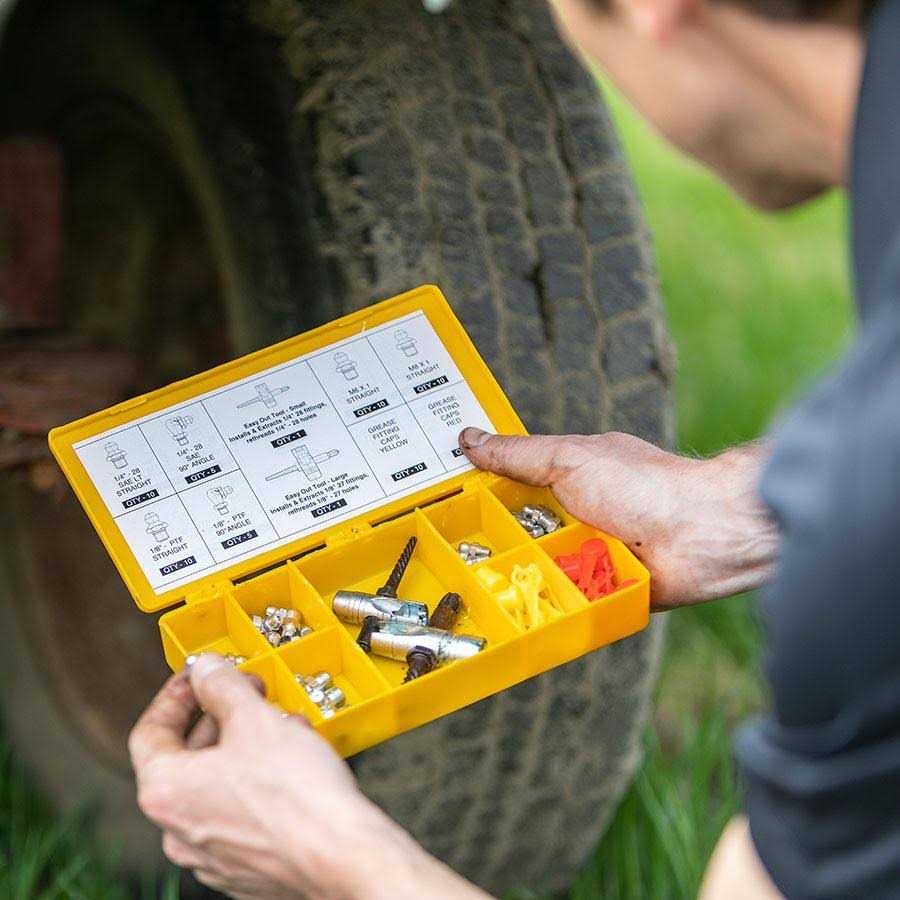 The ultimate grease fitting kit. Includes most common grease fitting sizes, two sizes of multi-tool, and 20 caps to keep fittings clean. If you’re tired of fighting with clogged and sticky fittings, this kit makes it fast and easy to repalce old fittings.