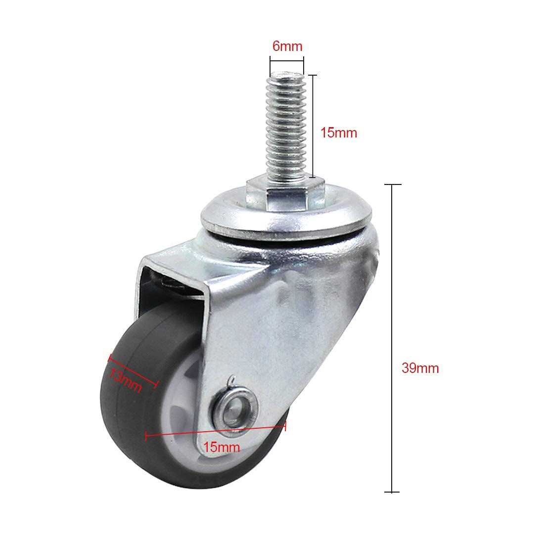 Widely Used: This Caster Wheels Are Suitable For Small Equipment And Small Space Furniture Including Coffee Table, Plant Stands, Bookshelves, Shoe Bins, Toy Bins, Shopping Carts, Workbench Wheel Size: 25 X 13mm / 1″ X 0.5″(D * T); Stem Size: M6 X 15mm / 0.24″ X 0.6″(D * H) Overall Dimensions: 40 X 27 X 54mm / 1.6″ X 1.1″ X 2.1″(length * Width * Height). The Maximum Load Per Wheel Is 8kg / 17.6lbs Package Contains: 8 X No Noise 1″ Stem Swivel Wheels, 8 X Hex Lock Nuts, 1 X Wrench
