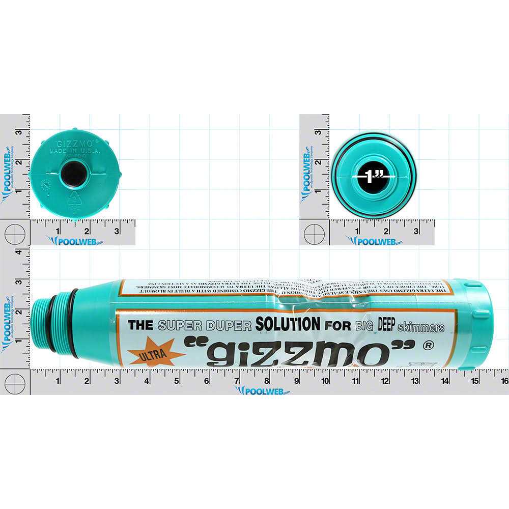 The Super New GIZZMO is 16 inches long and installs in the big deep skimmers of most in-ground swimming pools. The Super New GIZZMO has both 1 1/2 and 2 inch threads and features a generous bar style handle for your ease of use and convenience. The double threads offers convenience by accommodating most skimmers with one item. For a professional fit, the GIZZMO can be used with teflon tape. The GIZZMO is designed for single season use.