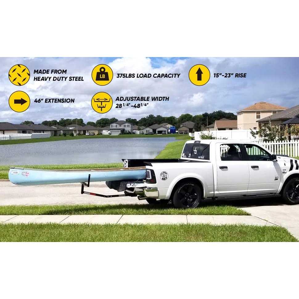 Our MaxxHaul 70231 Hitch Mount Truck Bed Extender effectively extends your truck bed for carrying longer payloads. Adjustable length and width allows for many different applications including: Ladders, Racks, Canoes, Kayaks, Long Pipes, Lumber and more. Constructed from heavy duty steel with reflective tape on the front and sides for increased visibility and safety. The side arms can be folded down to create supports for a portable work area and the 4 quick release clevis pins allow for quick assembly and disassembly. This product is designed to fit 2 in. Class III hitch receivers and has a load capacity of 350 pounds. Length: 53-1/2 in. from center of the 1/2 in. hitch pin hole to the end of extension. Adjustable width from 28-1/4 in. to 48-3/4 in., adjustable height from 4 in. to 10 in. Hitch pin sold separately. Highlights: – Made to fit 2 in. receivers – Adjustable design for a versatile use – Includes 4 release pins for quick and easy assembly General details: – Effectively extends your truck bed for carrying longer payloads – Adjustable length and width gives versatility for use in many different applications – Reflective strips on side and rear for added safety – Quick pins for easy assembly and installation – Durable power coat finish Product dimensions: – Hitch Receiver Size (in.): 2 – Product Height (in.): 3 in – Product Length (in.): 48 in – Product Width (in.): 20 in Product functional details: – Automotive Part Type: Canoe Carrier – Color: Black – Features: No Additional Features – General Part Type: Canoe Carrier – Hitch Class: Class III – Included Parts: No Additional Items – Material: Steel – Mount Location: Hitch – Product Weight (lb.): 36 lb – Returnable: 90-Day – Weight Capacity (lb.): 300 lb