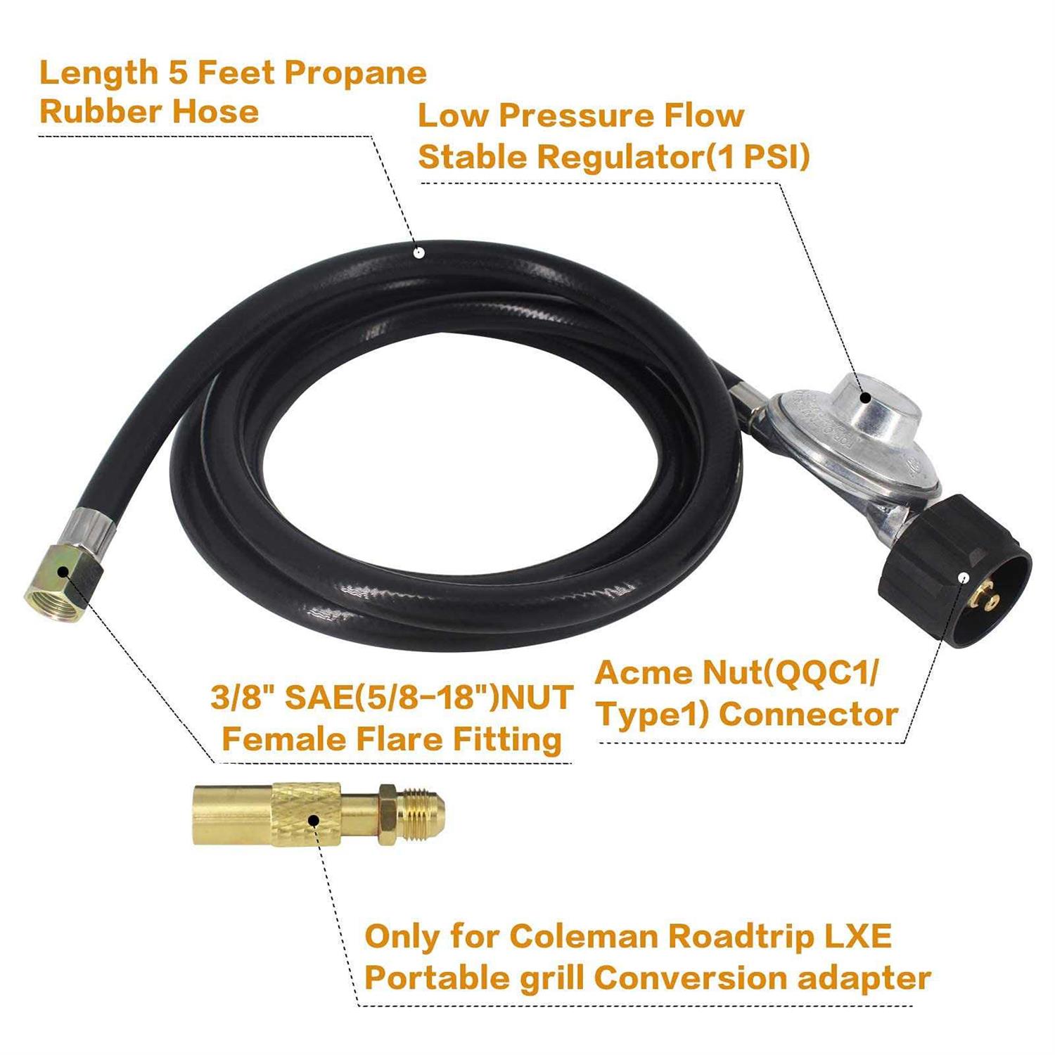 Brand: MCAMPAS Features: 5 FT Low-Pressure Regulator for Standard US Propane Cylinder with Special Adapter Conversion Fitting Use For Coleman Roadtrip LXE Portable Grill This Kit is Easy to Convert the Grill One Pound Regulator Connection To Bigger Tank Bottle if you are worried about the gas used out Great Converter for 5-40lbs propane tank cylinder for Coleman Roadtrip LXE Portable Grill CSA Certified Parts and Elbow Design Installation More Easy and save space. Good for RV Camper For Only Coleman Roadtrip LXE Portable Grill, Do not suitable for other Grill Model. Please before you order, Check the user manual of the portable stove to confirm compatibility. Details: Specifications: A. Low-pressure QCC1 type with 5FT Hose and outlet 3/8” Female flare(5/8”-18 NUF) thread B.3/8″ Male Flare Adapter Conversion Fitting For Coleman Roadtrip LXE Portable Grill Warm Tips: This conversion fitting Only fit for Coleman Roadtrip LXE Portable Grill. Do not suitable for other Grill Model. If you do not want to connect the hose to Coleman Roadtrip LXE Portable Grill,Also can remove the propane elbow adapter fitting on the hose and connect the hose to grill, Camp Chef stove, stove, fire pit, griddle, propane heater with 3/8′ Male Flare. Quality Standard: CSA Package Included: 1 Pcs x 3/8″ Male Flare Adapter Conversion Fitting 1 pcs x QCC1-5 feet propane hose with 3/8” Female flare(5/8”-18 NUF) thread 1 Pcs Operating instructions x precautions Instructions