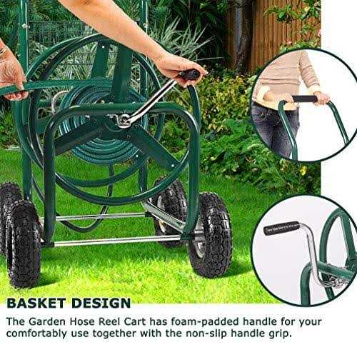 Heavy-duty garden hose reel cart with wheels water hose holder & storage basket. Store your garden hose safely and neatly with this robust garden hose reel cart. What’s still hesitating? Features: This is suitable for material handling applications in gardens, warehouses, construction sites, and shops. Our garden reel cart is also equipped with a rubber handle that can effectively protect your hands. A four-wheel hose reel cart with a basket is designed for all your garden and landscaping needs, they also make hose storage easy and stylish. The garden hose is easy to maneuver with pneumatic tires and includes a convenient storage basket.
