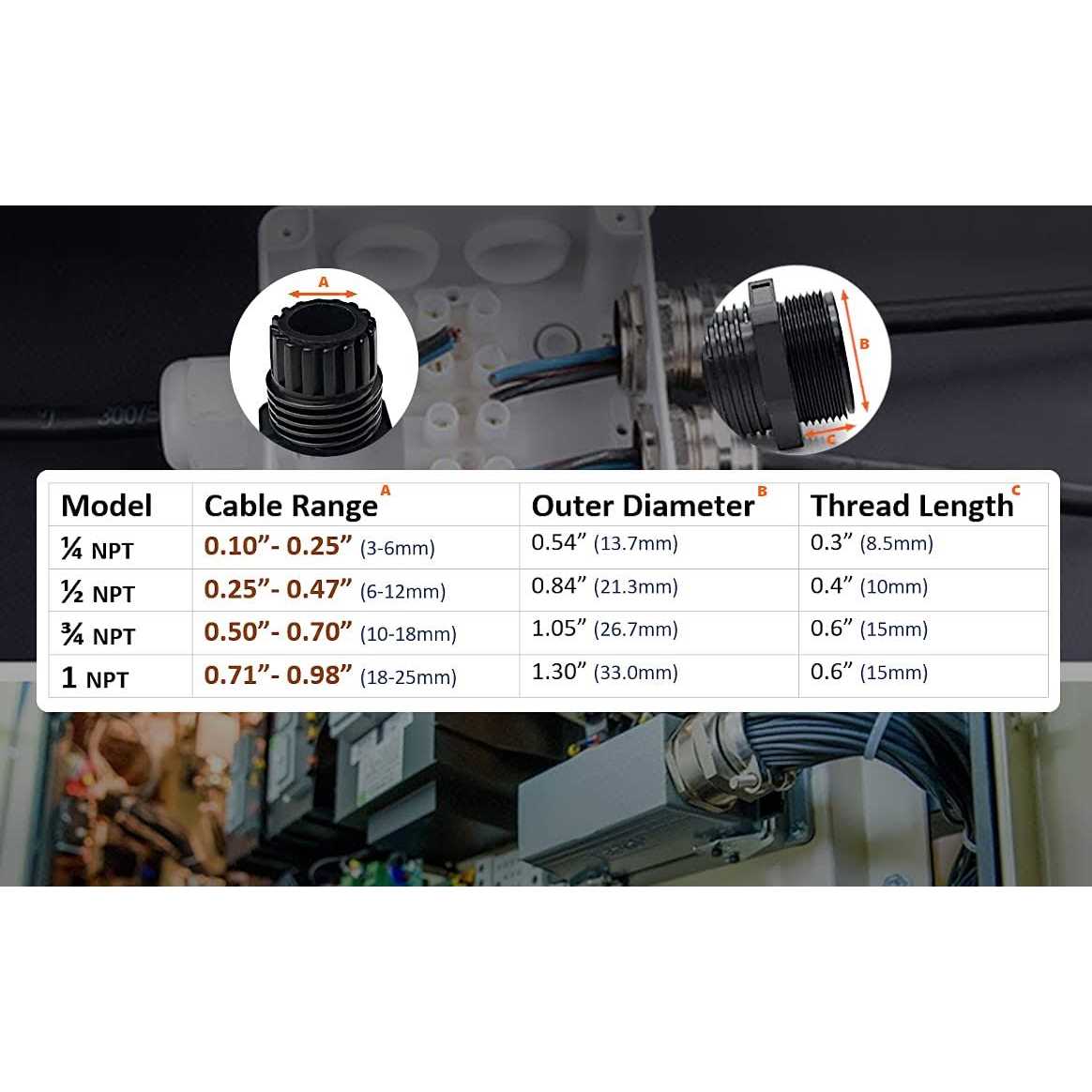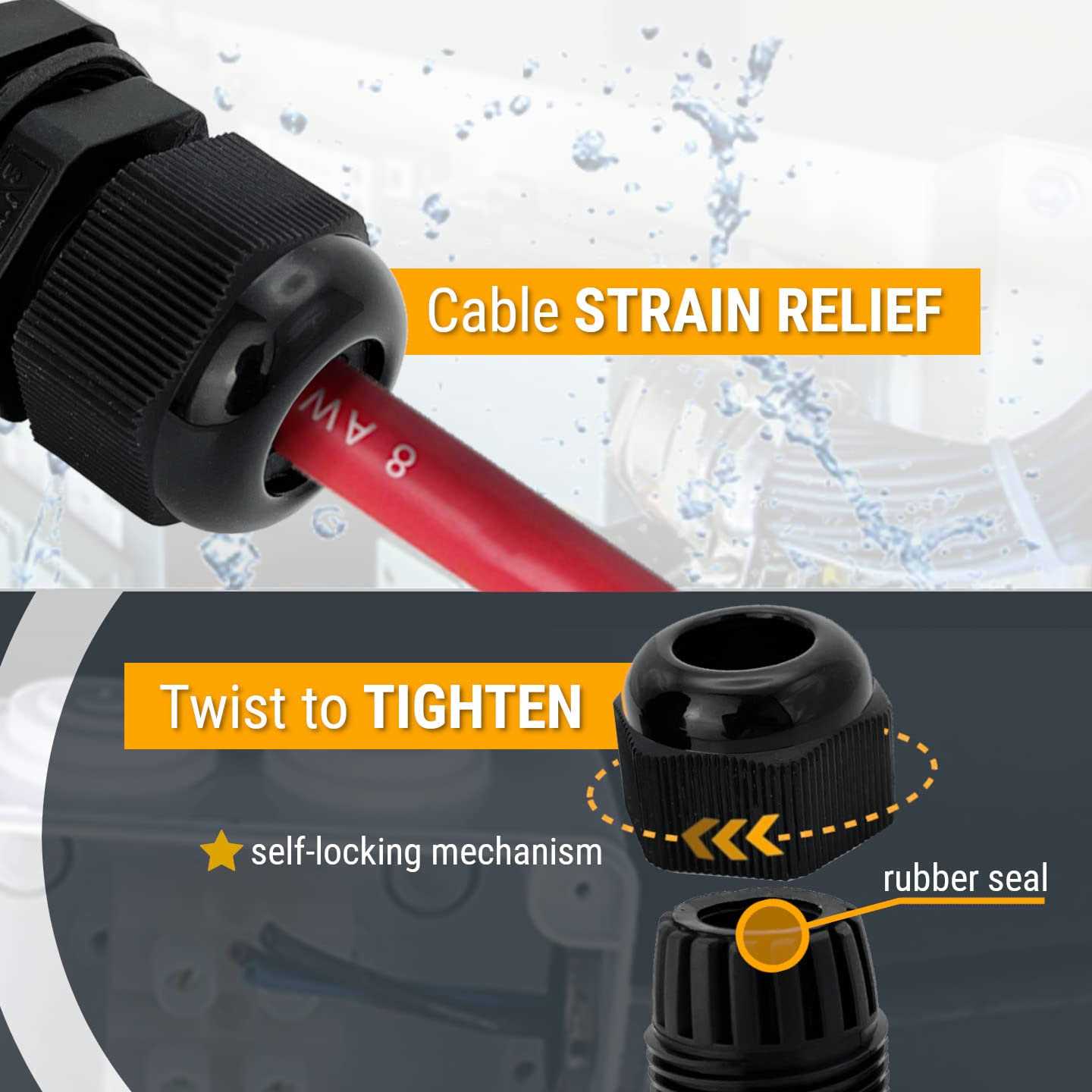 - EASY INSTALLATION — Simply pass your cable through the gland and tighten the cap. Fits 0.25″ to 0.47″ (6 – 12mm).