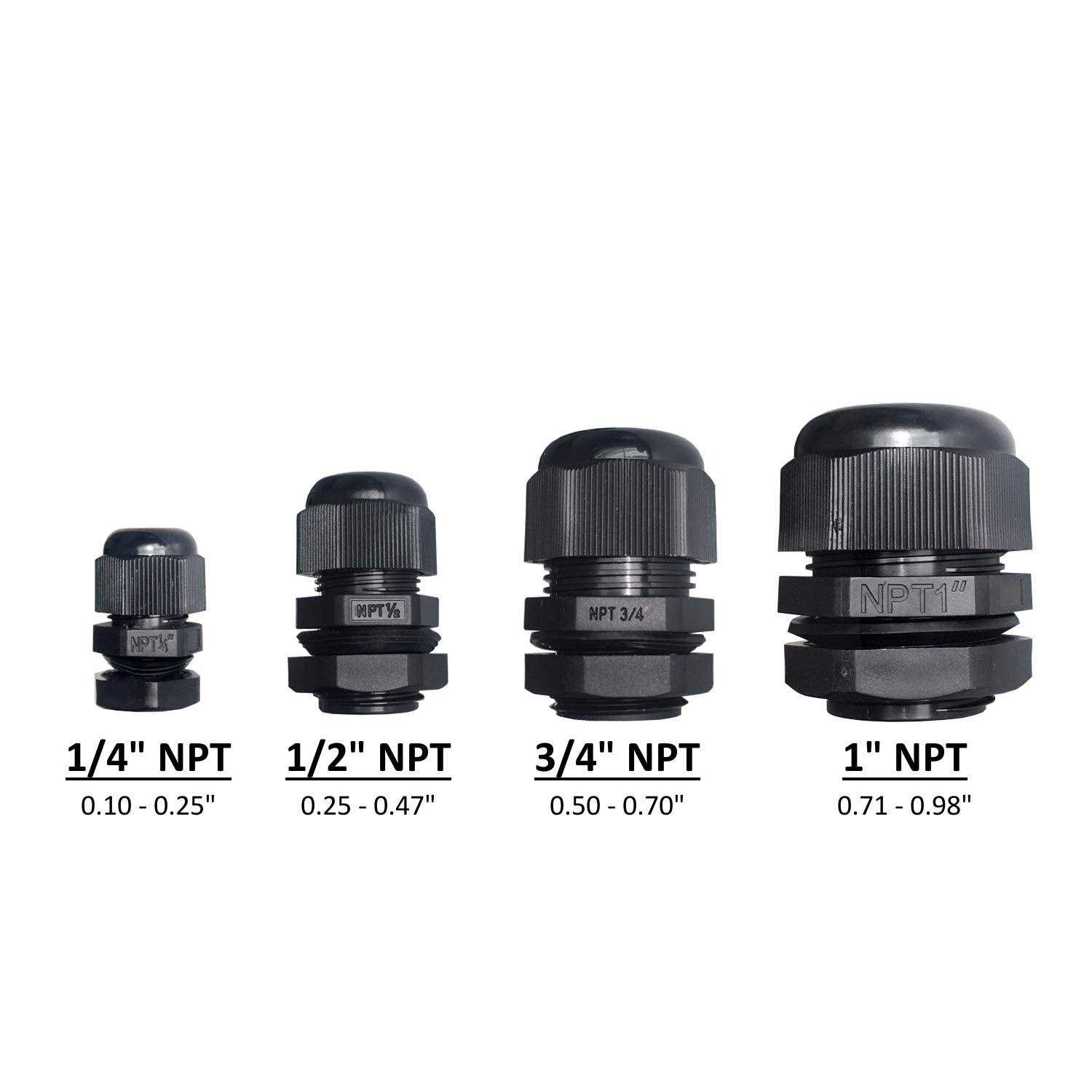 Protect and organize your through-panel wiring. Cable Glands provide strain relief while holding your electrical and/or automotive wires firmly in place. Supplied complete with gasket and locknut. THROUGH-PANEL PROTECTION A cord grip connector provides strain relief, stability, and edge protection to a cable or group of wires passing through a panel cutout or hole. Waterproof IP68 rated nylon design protects your wires from moisture and dust. Flammability UL94V-2 rating with static working temperatures of -40 to 212°F (-40 to 100°C) EASY INSTALLATION Simply tighten the top “dome” nut to compress the bushing and create a reliable seal. Your cable is centered, sealed, and completely strain relieved with a turn of the hand. PRACTICAL DESIGN Dome nut with ergonomically designed gripping grooves makes tightening by hand or with a wrench an easy task. Package Includes: 20 x ½” NPT cable glands What is NPT? NPT stands for National Pipe Thread, which is a U.S. standard for tapered threads having a 60 degree thread angle with taper angle of 1.79 degrees. Keep in mind that NPT thread is not compatible with metric or PG threads.
