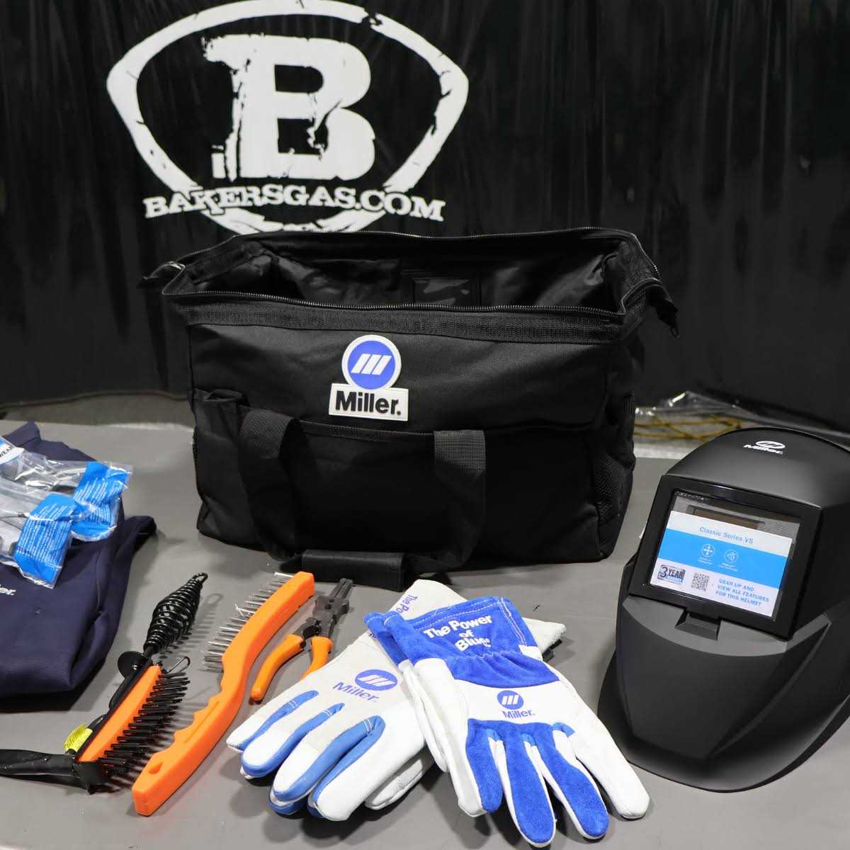 Kick off your school year with the Miller Safety Pack, ensuring you’re prepped and outfitted with comfortable and fitted PPE Save big on all the gear you need to start in the classroom. Get a 45% discount on this gear pack – Helmet FeaturesClearLightLens Technology:optimizes contrast and clarity in welding and light states and allows for a brighterlight state while not welding. – Three Operating Modes:Weld, cut, and grind provide enhanced versatility. – Apparel Features – Performance MIG & TIG Gloves:Unprecedented comfort and performance with exceptional dexterity and flexibility. Classic Cloth Jacket: 9 oz Flame-resistant cotton with finished hems and reinforced stitching for enhanced durability. Safety Glasses: Optimal eye coverage with increased comfort and style in shade #5 and clear. – Accessories Features – Chipping Hammer with a straight head and replaceable wire brush with durable handle. MIG Pliers feature a narrow jaw design to fit in TIGht spaces and also help with quick Nozzle cleanup. Wire Brush is a sturdy, high-quality Stainless brush with durable nylon, long, heat-resistant handle. Jobsite Toolbag allows for easy transportation and storage of welding gear. Bundle Includes Black Classic Series Helmet w/ Clearlight; Classic Cloth welding Jacket; Lined MIG Gloves; Multi-Task/TIG Gloves; Clear Safety Glasses; Shade #5 Safety Glasses; Miller Jobsite Toolbag; Chipping Hammer w/ Wire Brush; MIG Pliers/Multi-Function Tool; Long Handled Stainless Wire Brush; Review Video