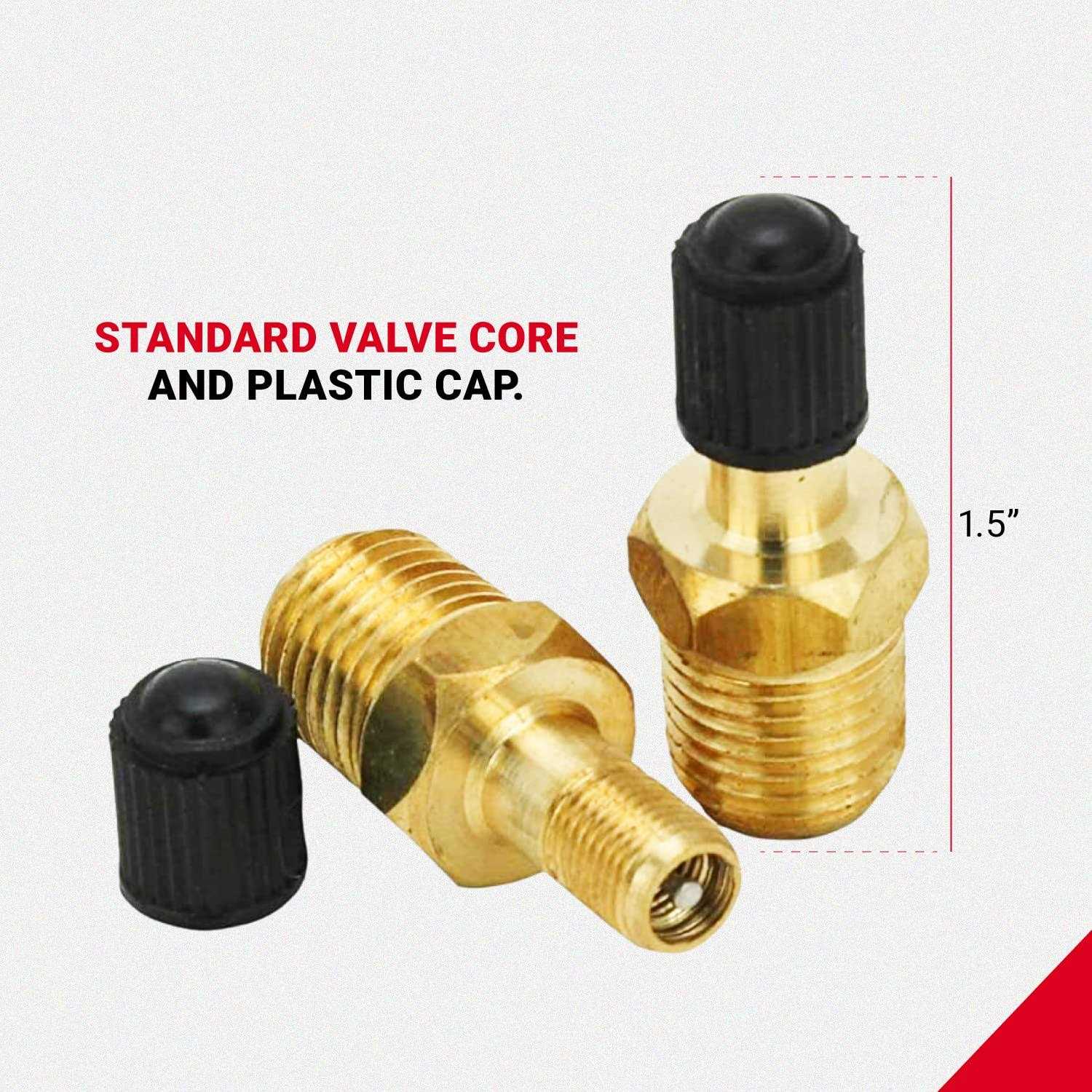 Features and Benefits: 1/4″ male national pipe threads Maximum of 200 pounds per square inch Valve prevents air from leaking out while allowing for air to pass through for inflating 1/4″ MNPT tank valves are designed for use in filling vessels with air. Standard valve core with plastic cap measures at 1 1/2″ overall length. Maximum pressure of 200 PSI. Cap thread size of .305-32.