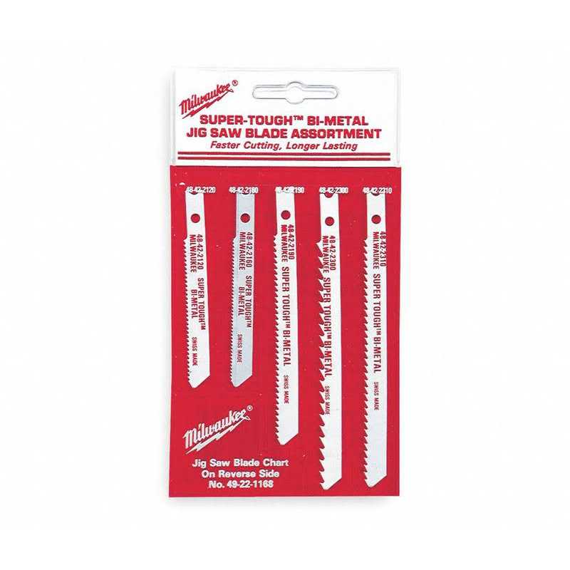 FEATURES: 5 Pack assortment, 9/32″ width, universal shank. Metal cutting blades: 48-42-2120, 48-42-2160, 48-42-2190, general purpose blades: 48-42-2300, 48-42-2310. This kit contains the most popular Jig Saw Blades with a 1/4″ universal tang. These blades fit Milwaukee Jig Saw model 6256-6 and other popular Jig Saws with this tang configuration. Assortment includes one each -2120 for metal over 1/8″, -2160 for metal under 1/8″, -2190 for metal over 1/4″, -2300 for nail embedded wood, and -2310 for nail embedded wood.
