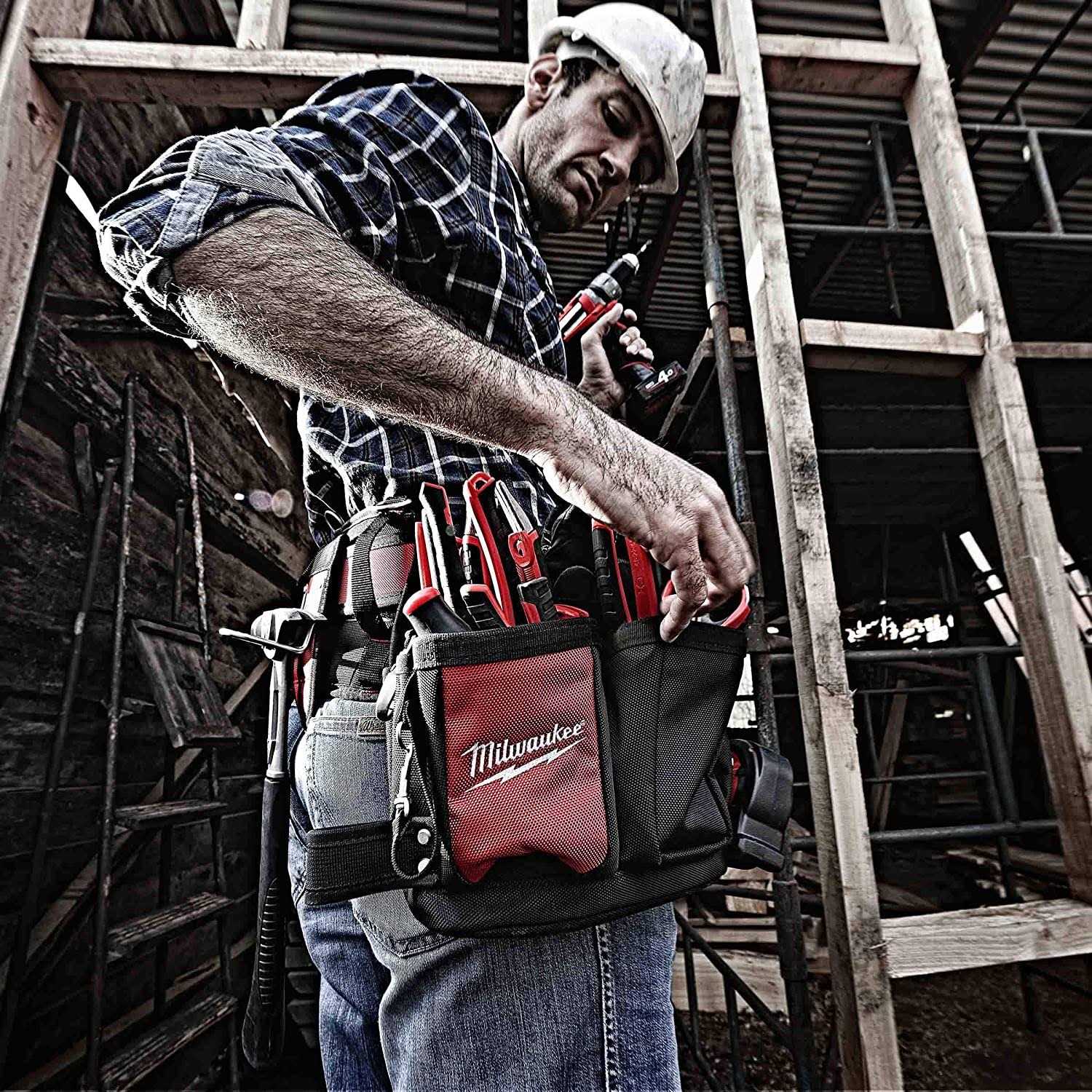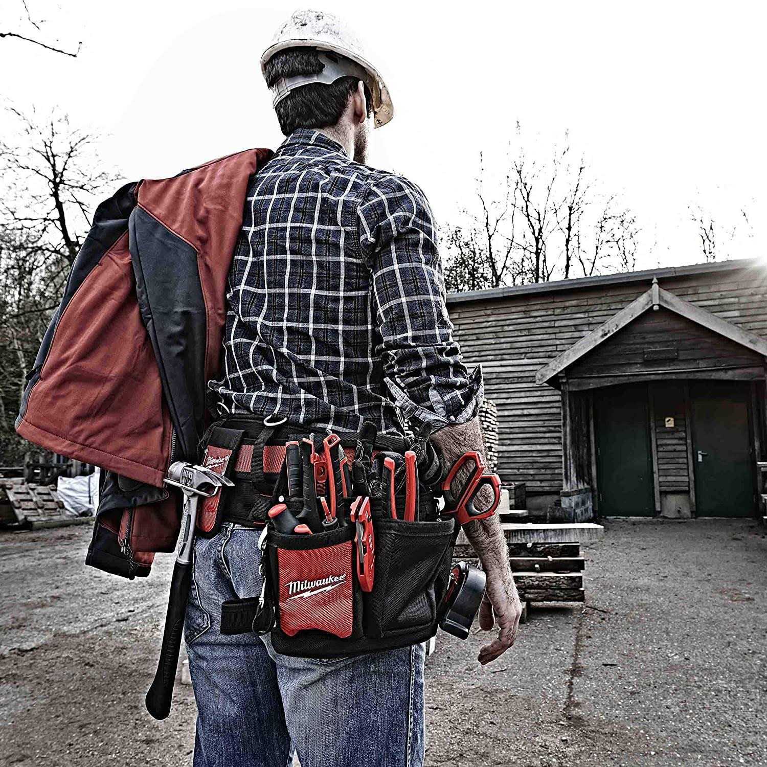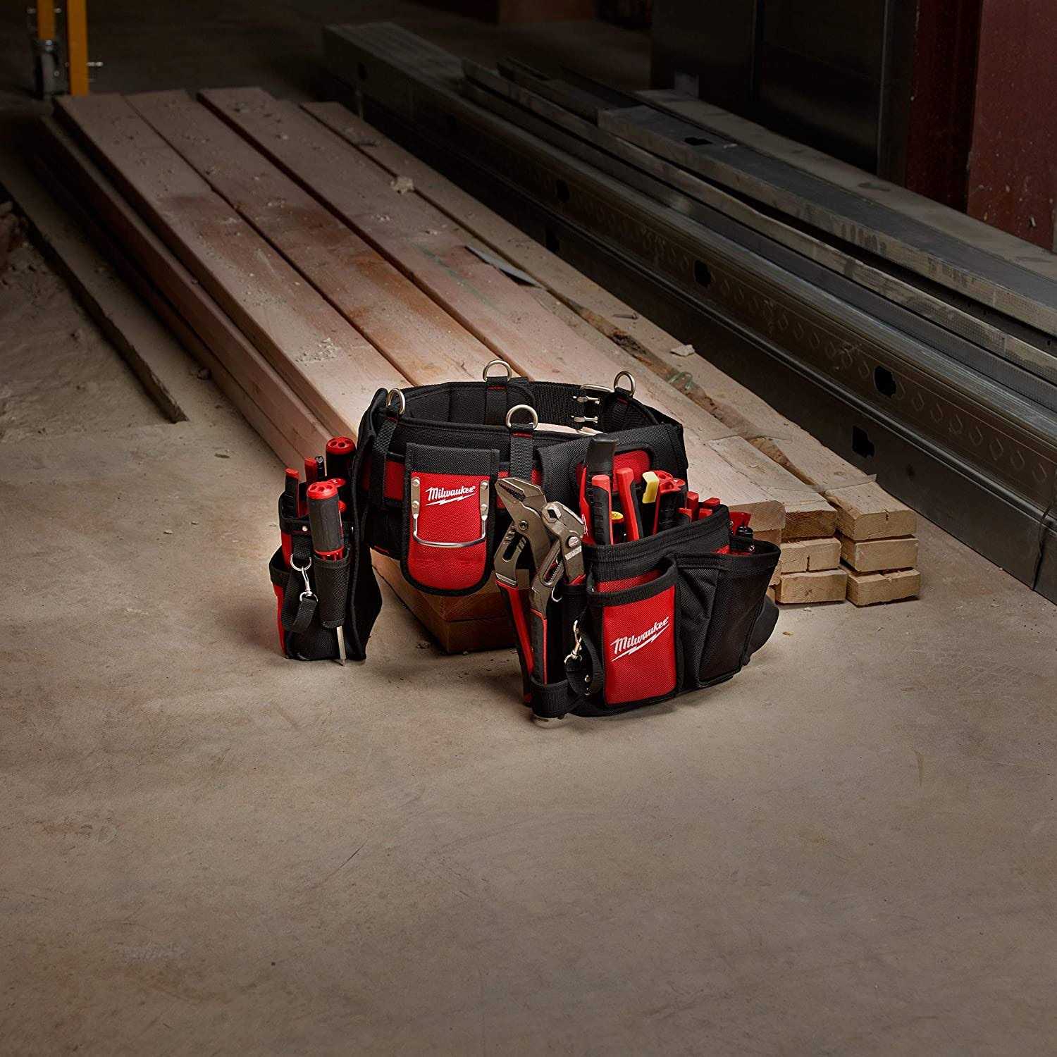 Milwaukee Work Gear is Nothing But Heavy Duty. Designed with professional tradesmen in mind and Built with 1680 Denier Nylon, Riveted Seams, and All Metal Hardware, Milwaukee work gear is up to 5X More Durable than competitive products and provides users with unmatched Durability, Comfort and Organization. The Electricians Work Belt provides users with 29 pockets to organize their tools and incorporates a solid base that allows the belt to remain upright when set on a flat surface. The integrated handles allow the individual bags to be removed and easily transported from and task to task, while the metal tape measure clip securely stores a tape measure for easy access. A plastic lined puncture-resistant pocket allows users to store sharp objects, such as jab saws, without worry of damaging their bags and the included work belt is padded and breathable for all day comfort. This combination of extreme durability and functionality confirms Milwaukee’s commitment to providing innovative, durable solutions to the end user. Padded and breathable for all day comfort 29 pockets to organize your tools the most efficient way possible for your day Individual bag handles allow easy removal and transportation Solid base keeps belt upright when set on a flat surface Pockets lined with puncture-resistant plastic to prevent damage by sharp objects