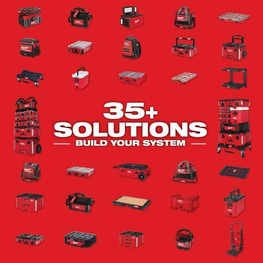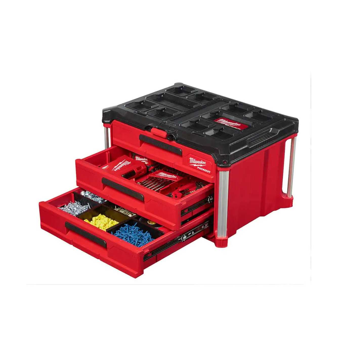 The PACKOUT rolling tool box is constructed with impact resistant polymers and metal reinforced corners so it can withstand harsh jobsite environments. The rolling tool storage box connects with all other PACKOUT system components via integrated locking cleats and features a 250 lbs. of weight capacity. An industrial-grade extension handle and 9 in. all-terrain wheels ensure the tool box can be rolled anywhere on the jobsite. An IP65 rated weather seal protects tools and accessories from rain and other jobsite debris. Interior organizer trays allow users to keep equipment organized to fit their needs. Reinforced hinges and carry handle ensure the rolling tool box is easily transportable wherever it is needed. The Milwaukee PACKOUT 3-Drawer Tool Box has a 50 lbs. weight capacity and a locking security bar that secures the drawers during transport and allows users to padlock the drawers closed keeping them securely shut during transport. As part of the PACKOUT Modular Storage, the toolbox provides users customized storage solutions for easy transportation and organization of their tools and accessories. This portable toolbox with drawers is constructed with impact-resistant polymers, all-metal ball bearing slides, and metal reinforced corners for ultimate jobsite durability. The 3-Drawer Tool Box also allows users to customize their drawer layout with Quick-Adjust Dividers.