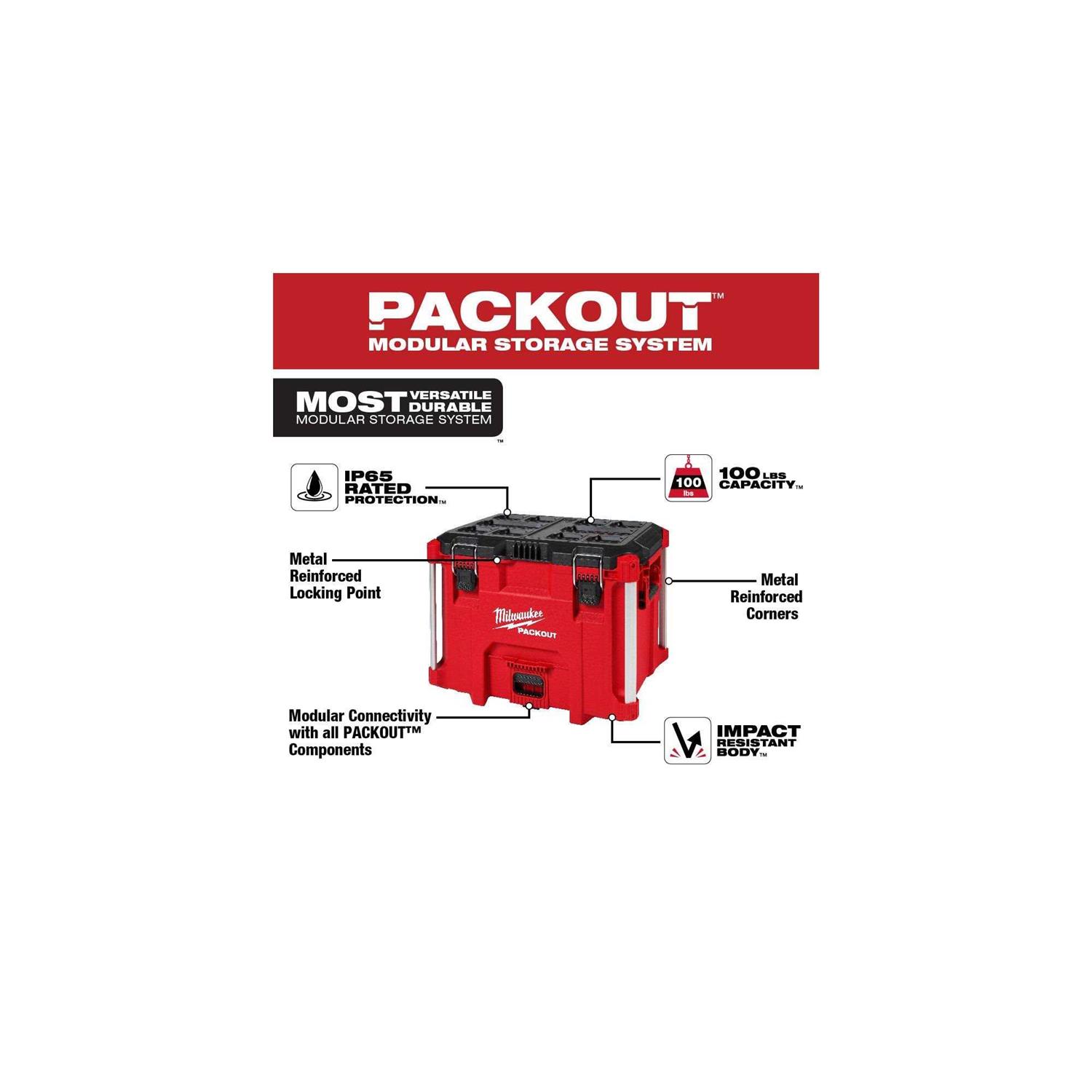 The Milwaukee PACKOUT XL Tool Box is constructed with impact-resistant polymers and metal reinforced corners to withstand harsh jobsite conditions. The tool storage solution connects with all other PACKOUT system components via integrated locking cleats and has a 100 lbs. weight capacity. This extra-large tool box has an IP65 rated weather seal that protects tools and accessories from rain and other jobsite debris. The interior organization tray keeps users’ equipment organized to fit their needs. The PACKOUT modular storage system allows users to customize and build their storage system to easily transport and organize tools and accessories. Milwaukee PACKOUT is the industry’s most durable and versatile storage system.
