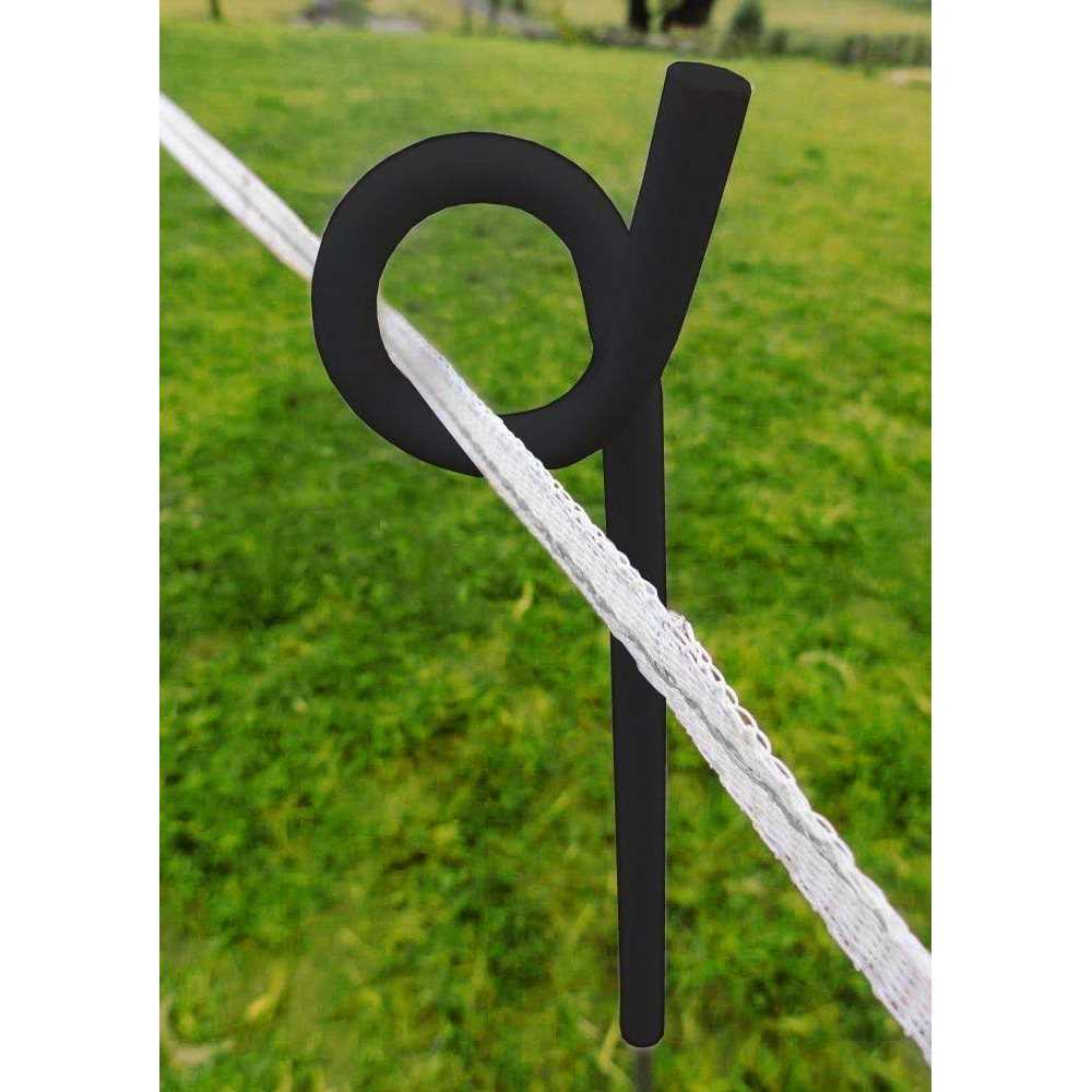 Metal Pigtail Post, 39″ Long, 35″ Above Ground, Steel/ Black Pigtail. Sturdy construction with a 7″ welded, 2-pronged foot base, and insulated pigtail. Perfect for hard-to-contain animals like calves. Holds 3 strands of wire, polywire, or rope to 35″ above ground. Use with 3 wire, 6 wire or 9 wire Polywire.