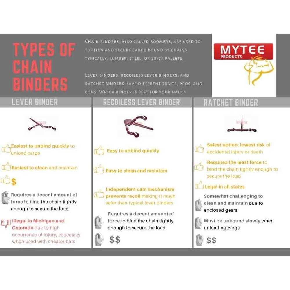 Load Binders by Mytee Products. Details:Working Load Limit:9,200Capacity:27,600 LbsFits: 3/8″ – 1/2″ chain – Handle Length: 13.92 inches – Barret Length: 9.92 inches