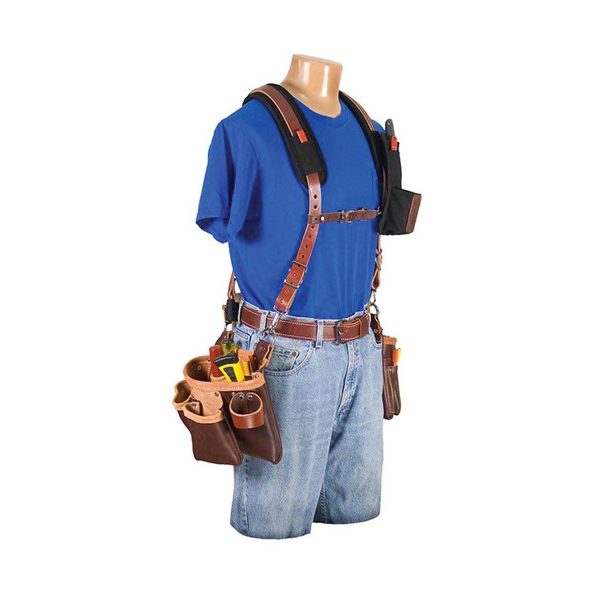 The most pouches offered in the Leather Beltless Series. With the same tool holder organization as the 5095 plus two more pouches. Includes the 5156 Cradle Hammer Holder on rear. Experience greater range of motion, balanced tool carrying capacity, and lower back relief through freedom from a tool belt. Sleeves on suspension system accept a wide variety of clip-on tool holders and accessories.