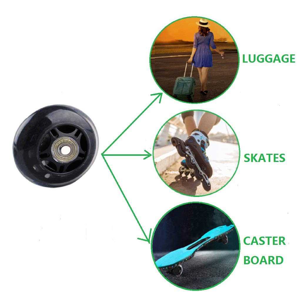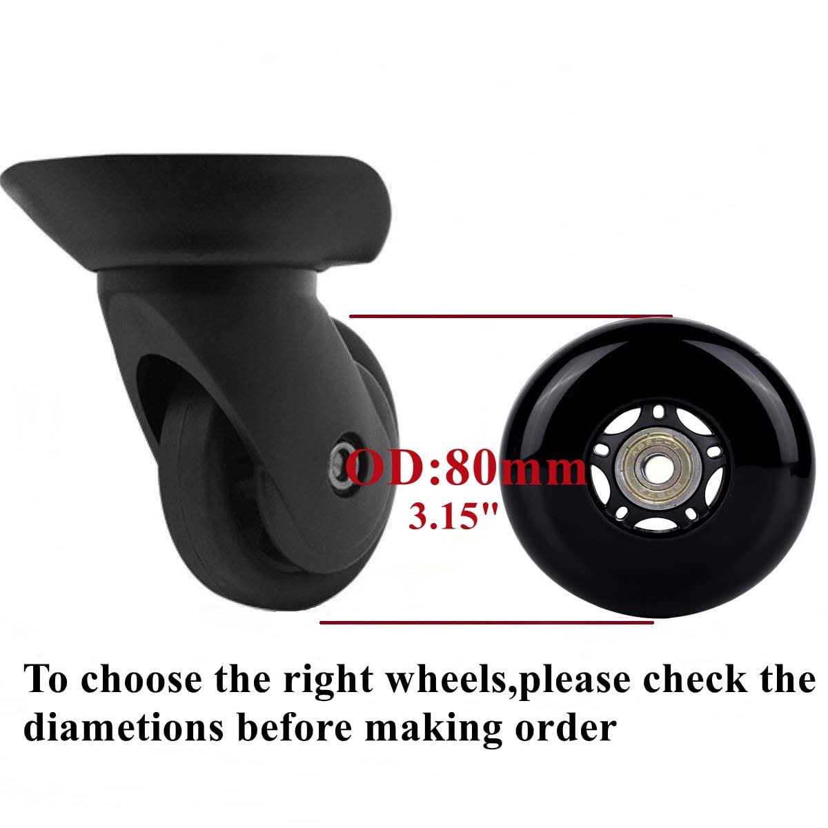 MATERIAL:High Quality Polyurethane Replacement Wheels for Suitcase,Roller Skate,Caster Board,Radio Flyer,Mini Micro,Razor Globber scooters,Razor Crazy Cart,Razor Riprider 360 capable of fitting a 80mm wheel. – Very Quiet Running ,Anti-abrasive, Absorbs Shock SIZE:Replacement Wheel OD:80mm(3.15″),Wheel Wide: 24mm(0.94″),Bearing ID:8mm(0.31”),Axle:40mmx8mm(1.57″x0.31″),35mmx8mm(1.38″x0.31″). Two sizes of axles, more convenience for you.. INCLUDE:2x80mm Suitcase Replacement Wheels,4 Axles,4 Washers,2 Wrenches,2 Rivets EASY TO INSTALL:To Remove The Original Wheel With A Hacksaw At The Gap, Then Install The New Wheel With The Repair Kit NOTE:In Order to Choose The Correct Size Wheels For You. – Before Making Order, Please Check The Wheel Dimension, Bearing Dimension and Axle Dimension. The Wheels for Luggage fit most of the Luggage NOT All. Before making order, Please compare the size of the new Wheels with the old wheels which you have. – These Replacement Wheels are the same for front and rear. – Perfect for project,luggage case,inline outdoor skate and caster board and so on. *High quality polyurethane wheels with the following characteristics:beautiful,flexible,mute,wear,not easy to breakSpecification:Material:PolyurethaneWheel OD: 80mm(3.15″)Wheel Wide:24mm(0.94″)Bearing ID:8mm(0.31″)Bearing Depth:26mm(1.02″)Axles:40mm(1.57″) (the distance from the head to the snap ring groove is 40mm.)35mm(1.38″) (the distance from the head to the snap ring groove is 35mm.) Package Includes:2x Wheels replacement2X Axles 2X Axles screws4X Washers2X Wrenches