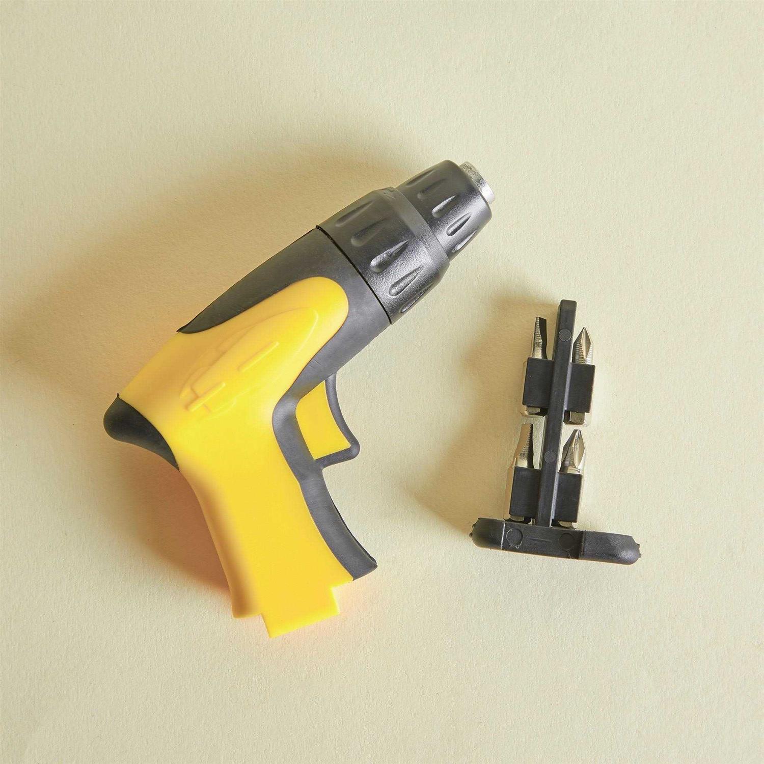 You Know The Drill Multi-Tool Now you can tackle that list of fix-it chores with this fun, unique and practical hand tool designed to resemble a cordless power drill. Compact size, it is supplied with 2× crosshead and 2× flat head interchangeable screwdriver bits, each of a different size to tackle a variety of jobs. The 4× screwdriver bits are safely stored in the bit holder that fits neatly into the handle so they will always be close at hand when you need them. This clever little hand tool is operated by a mechanical ratchet mechanism so it doesn’t require any batteries which means it is always ready when you are. Featuring both clockwise and anti-clockwise functions to cope with all your D. I.Y. tasks. Hand rachet with 4× interchangeable drill bits; 2× crosshead and 2× flat heads (in differing sizes) on a printed card with euro hook slot.