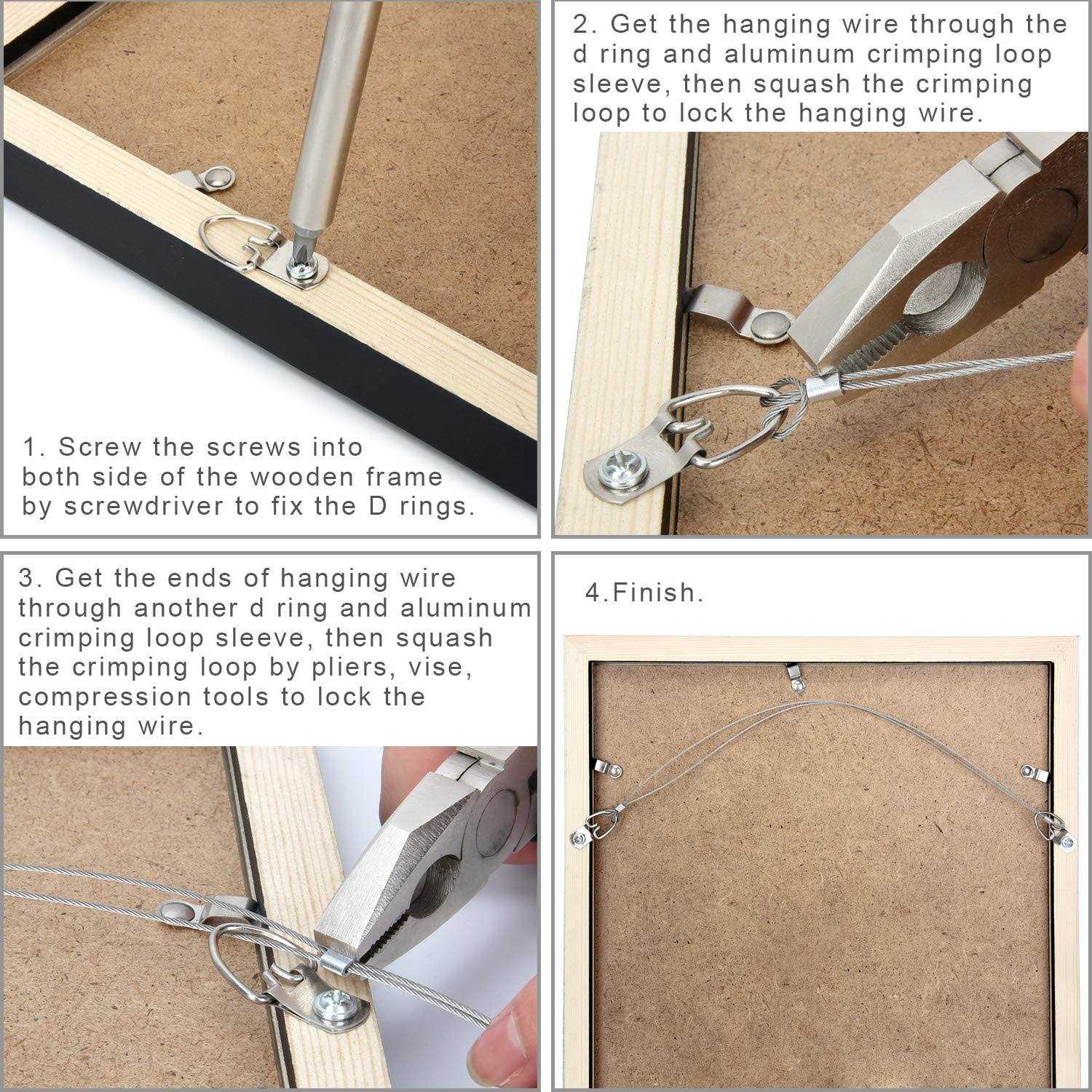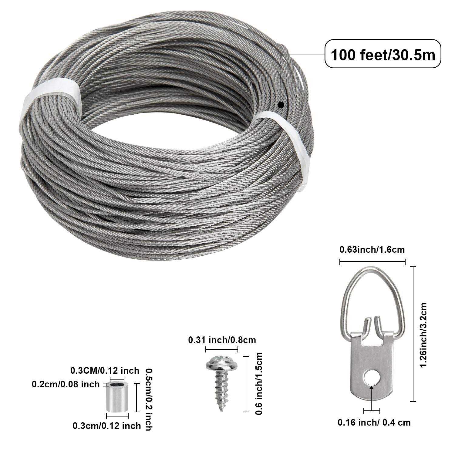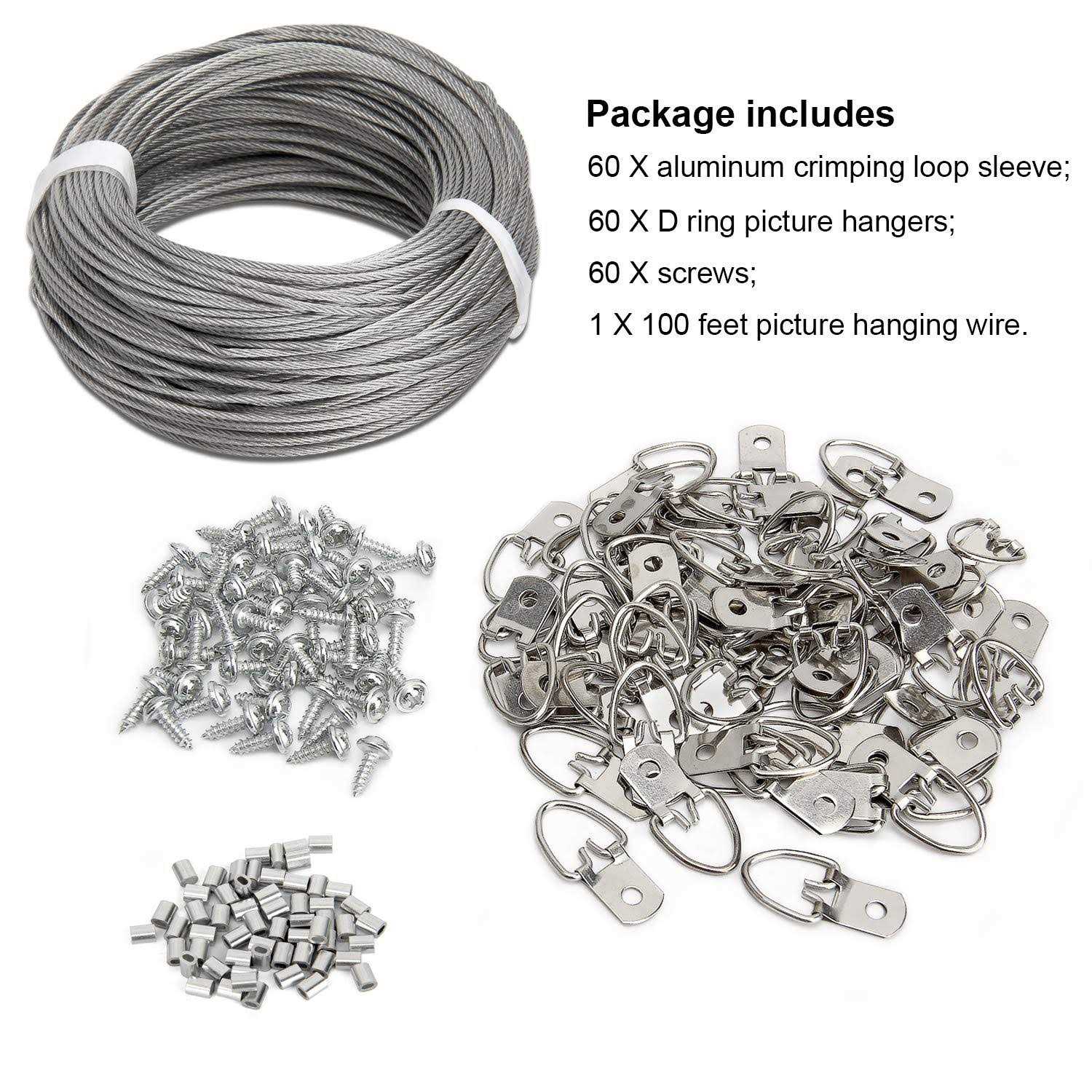 ? Valued Picture Hangering Kit? Package includes 100 feet picture frame hanging wire, 60 pcs D ring picture hangers, 60 pcs screws, and 60 pcs aluminum crimping loop sleeve enough quantity that do not need to buy again for a long time.? Size Information? The picture hanger measures 3.2 cm/ 1.26 inch in length, 1.6 cm/ 0.63 inch in width, and the round hole diameter is 0.4 cm/ 0.16 inch Screws: 1.5 x 0.8cm/ 0.6 x 0.31 inch (L x D) aluminum sleeve: 0.19 X 0.16 X 0.12 inch/ 0.5 X 0.4 X 0.3cm (L x W x H).? Durable and Flexible? Our picture hanger is made of nickel plated mental, heavy duty and strong, good work with flexible metal picture hanging wire Hanging wire is made of braided stainless steel cable, it is resistant, supports up to 30 lbs.? Easy to install? Each picture hanger comes with a screw, simply screw into your frame, and the aluminum crimping loop is great to help lock the wire ends.? Wide Applications? Use for hanging pictures, oil paintings, crafts, picture canvas and photo frames and so on.
