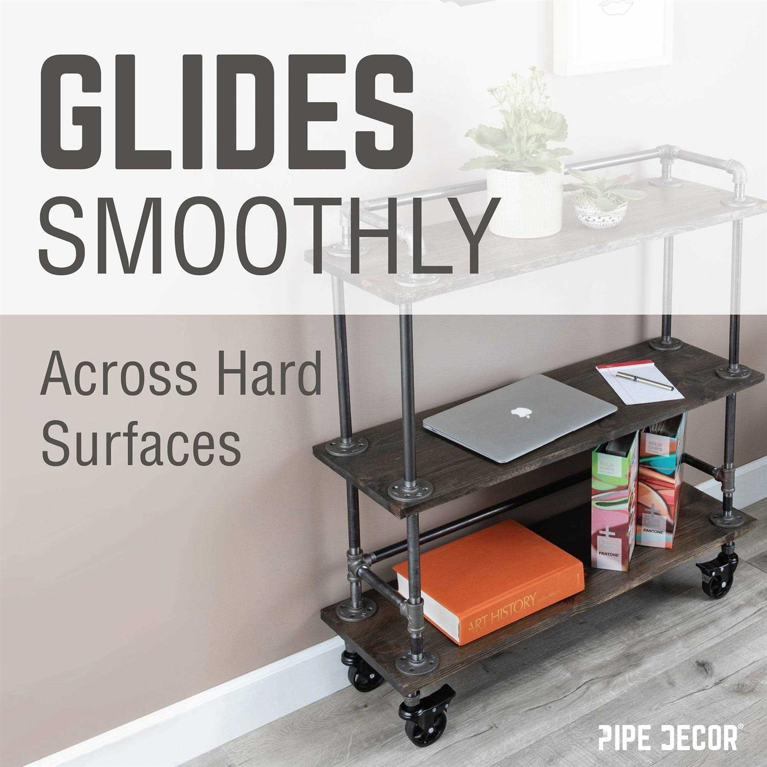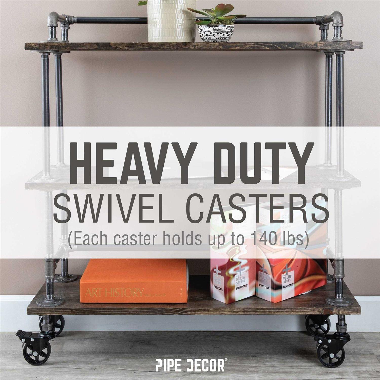 No tools are necessary for installation, simply screw the cap onto the end of your pipe project and you’re ready to go. These caster wheels have a 360° swivel supported by sturdy ball bearings, so you can smoothly maneuver into tight spaces with no squeaking noise and no floor scuffing. Create rolling work benches, tool carts, bar carts, storage racks, side tables, and more. The sturdy metal toe brake can withstand foot pressure while the ribbed pedal provides extra grip, allowing you to lock and unlock it with ease. Color: Black.