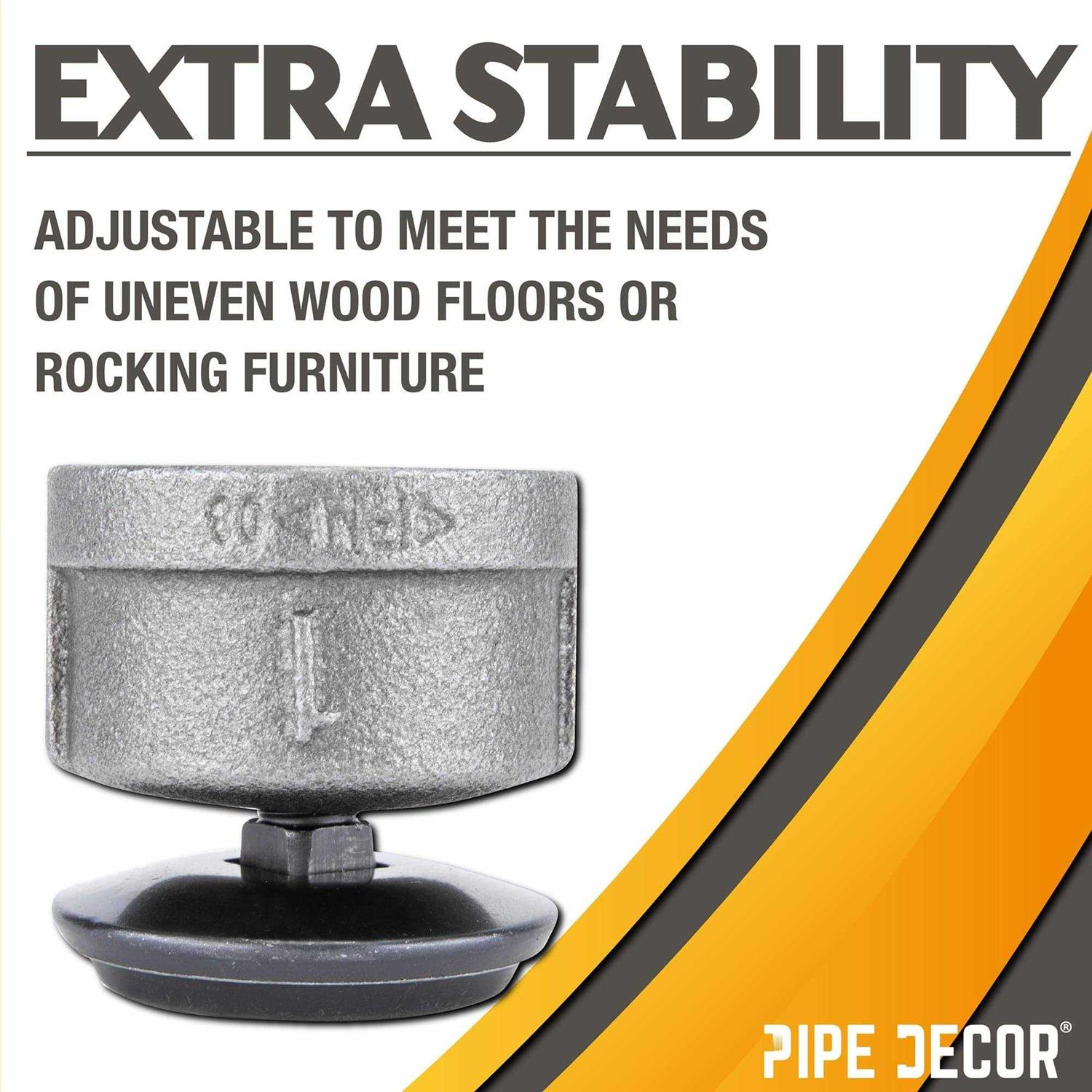 Take your Pipe Decor to the next level, Customize your pipe furniture with these levelers to add more height or compensate for uneven flooring. Levelers protect the floor from furniture legs that can scratch, gouge, or cause indentations. No more marring and scraping your floors when trying to rearrange your furniture. Furniture levelers help pipe furniture glide seamlessly across wood, tile, and linoleum flooring. Rearrange your furniture to achieve your perfect layout with little effort. These heavy-duty furniture levelers are perfect for home, office, or industrial use. Elevate work benches, tool racks, tables, and more. Levelers are scratchproof for long-term use Easy to use, no tools or hardware necessary for installation Metal body and sturdy plastic foot can withstand pressure and provide stability Each leveler can be adjusted for a variety of heights Supports up to 100 lbs. per leveler Product specs; 1¾ inches L x 1¾ inches W x 1¾-2 ⅝ inches H; pair with any 1 inch pipe Fix wobbling or add height to your pipe tables, shelving racks, wardrobes, and more null Take your Pipe Decor to the next level, Customize your pipe furniture with these levelers to add more height or compensate for uneven flooring. Levelers protect the floor from furniture legs that can scratch, gouge, or cause indentations. No more marring and scraping your floors when trying to rearrange your furniture. Furniture levelers help pipe furniture glide seamlessly across wood, tile, and linoleum flooring. Rearrange your furniture to achieve your perfect layout with little effort. These heavy-duty furniture levelers are perfect for home, office, or industrial use. Elevate work benches, tool racks, tables, and more.