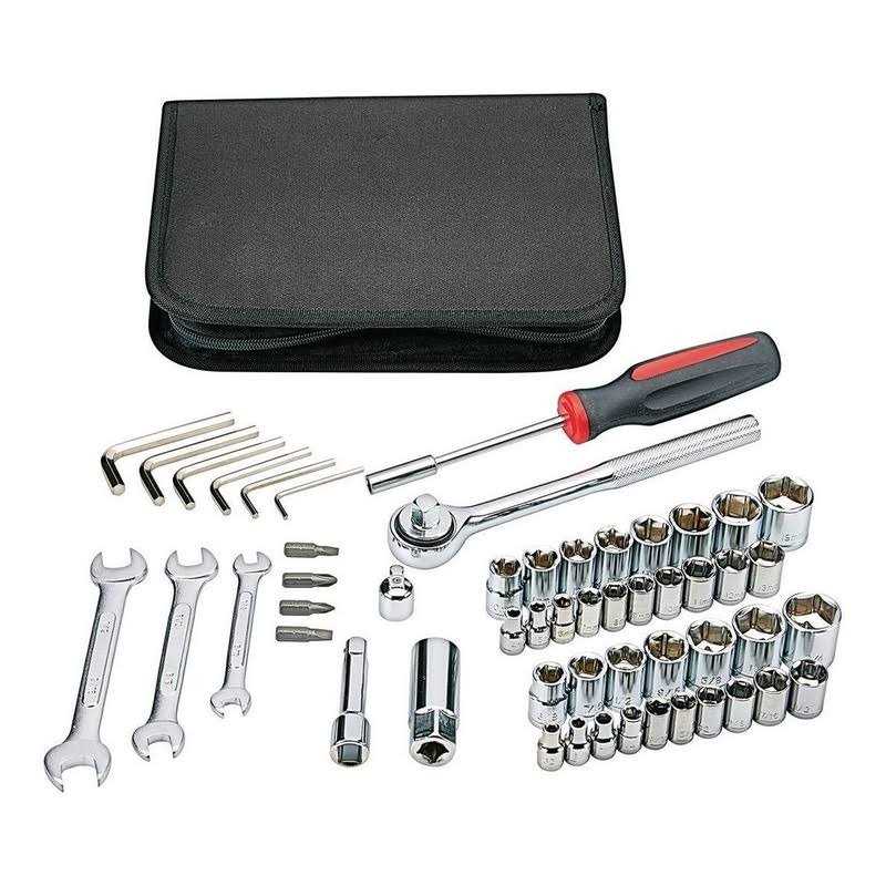 This handy tool kit of metric and SAE wrenches is the perfect size to stash in your car or truck. Each socket is clearly marked for easy identification. The tool kit also includes Phillips and slotted drivers in popular sizes. The heat-treated steel assortment comes with a durable zip up case for storage and portability.