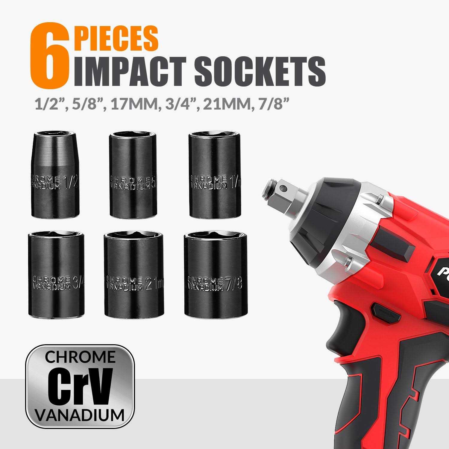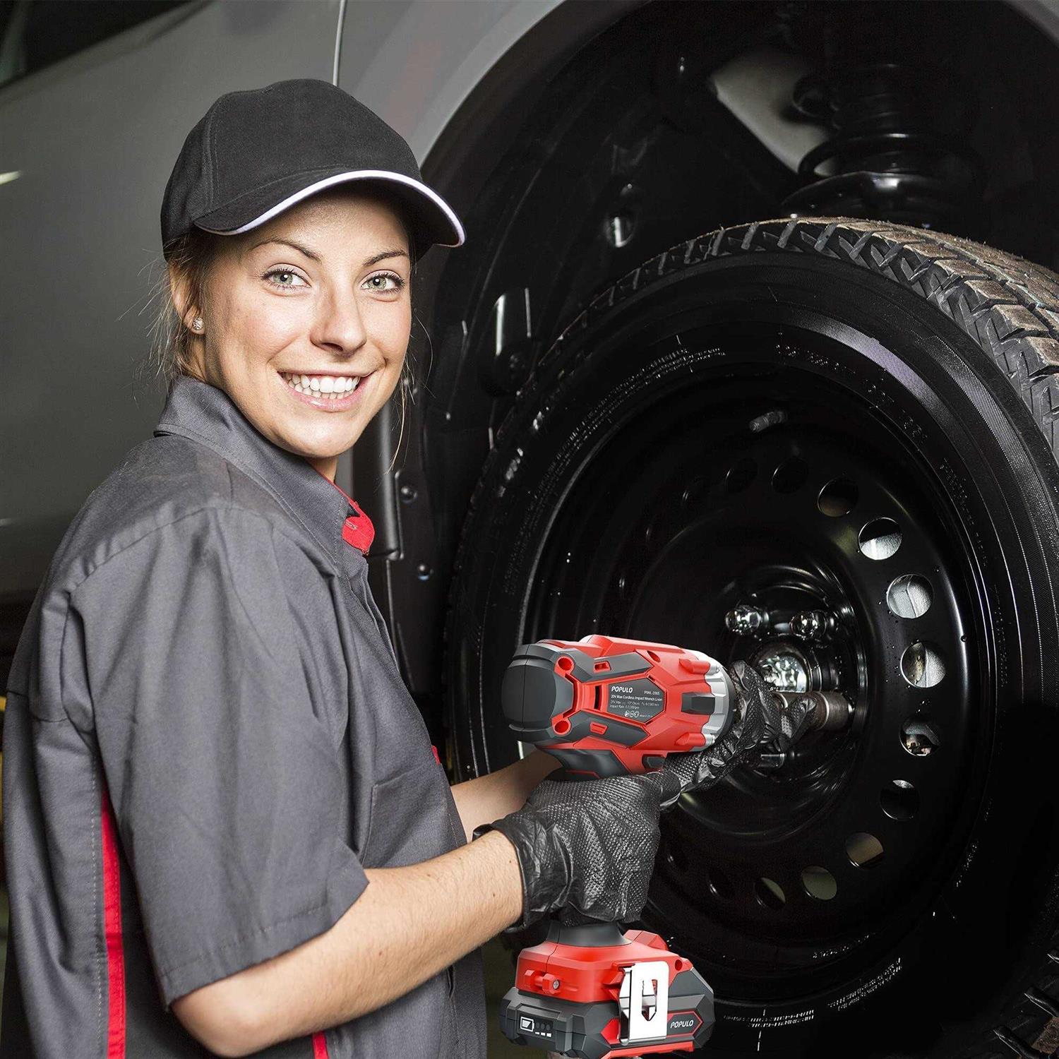 Multi-purpose Use: Populo 20V cordless impact wrench kit including battery, charger and accessories etc. The 4-poles motor with quick brake function that delivers a max torque of 2389 in-lb with a max 3,000 ipm impact, power enough to break off stubborn fasteners, rusty nuts and bolts in seconds. This power impact wrench set is greatly suited for removing tires from cars, motorcycles, automotive repairs, major construction projects, heavy duty maintenance, or product assembly.