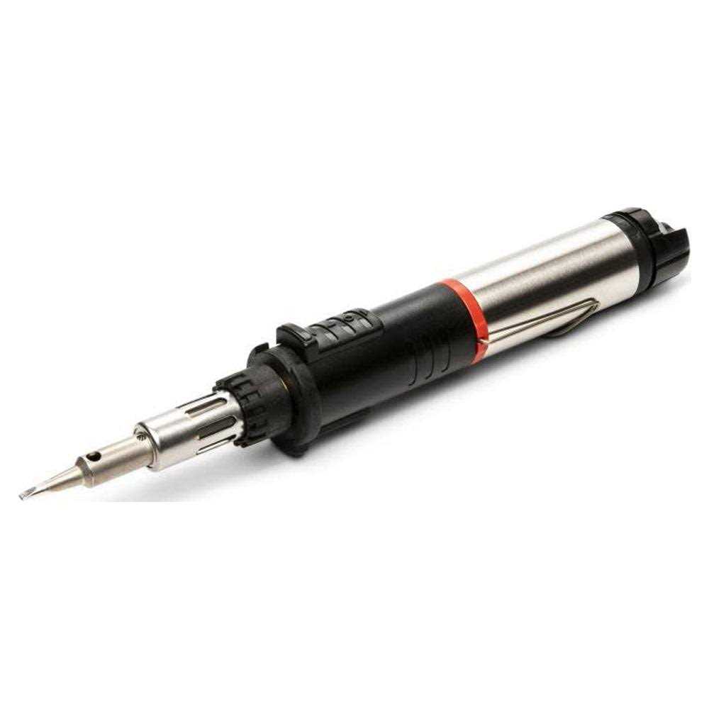 Portasol Self-Igniting Butane Soldering Kit features a safety shut-off that saves energy and helps prevent accidents. Temperature adjusts to as high as 1076F. Kit contains a soldering iron sponge stand and four tips2.4mm double flat 4.8mm double flat hot blower and hot knife. Includes case.
