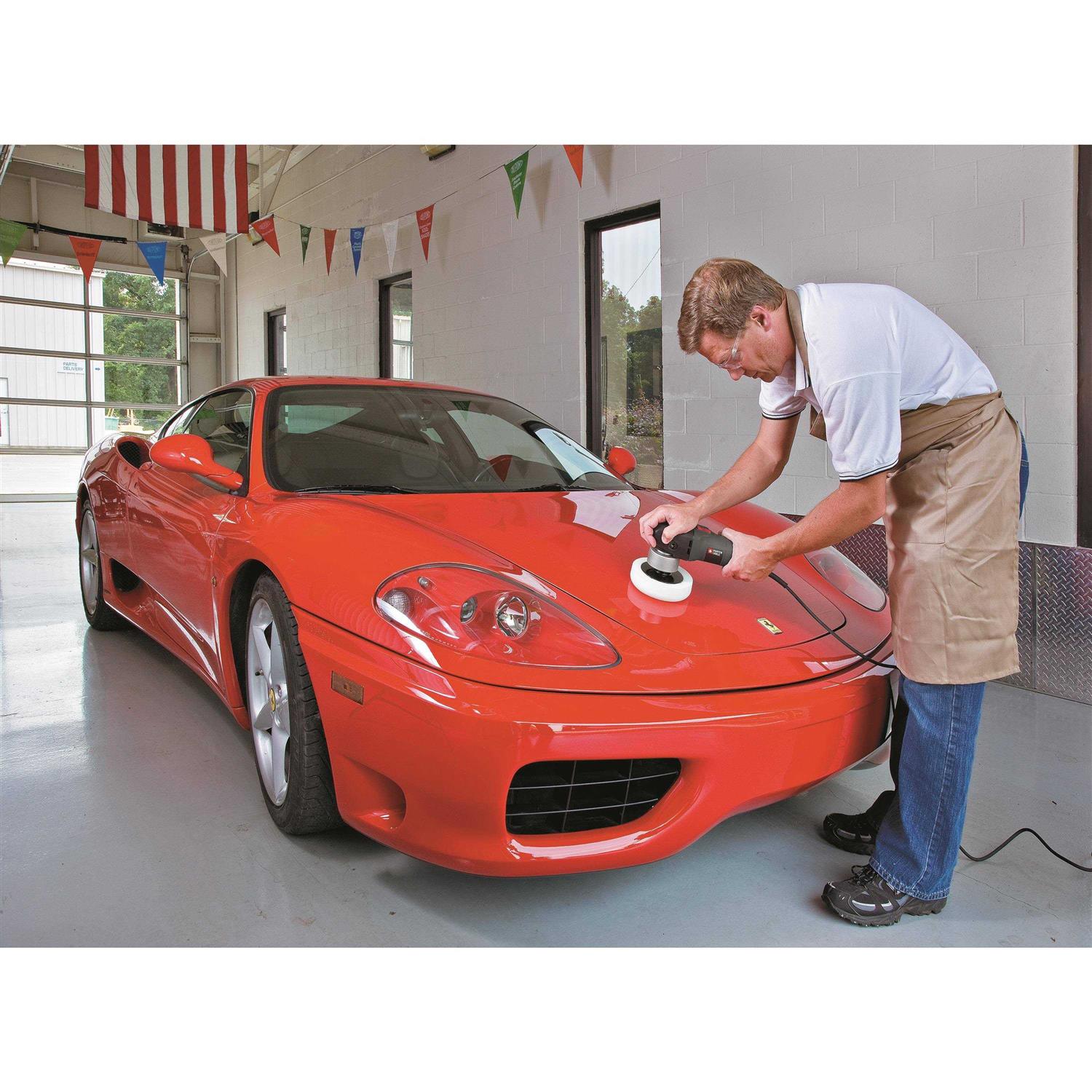 Ideal for polishing and sanding automotive and marine projects the Porter-Cable 7424Xp 6-inch polisher features a 4.5 amp motor for high overload protection and random orbit. It comes with a 6-inch polishing pad. Nicely compact at just 5-1/2 pounds the 7424Xp offers swirl-free sanding/polishing action with an electronic variable-speed dial that operates at 2500-6800 orbits per minute Opm. The 7424Xp accepts 5/16 to 24 spindle thread accessories and it offers a full ball and roller bearing construction for durability under industrial workloads. It includes a 6-inch proprietary counter balance for use with a 6-inch sanding/polishing pad and it features a two-position left or right removable side handle for greater comfort and control. The polisher measures 11.5 x 10.5 x 6 inches LxWxH.