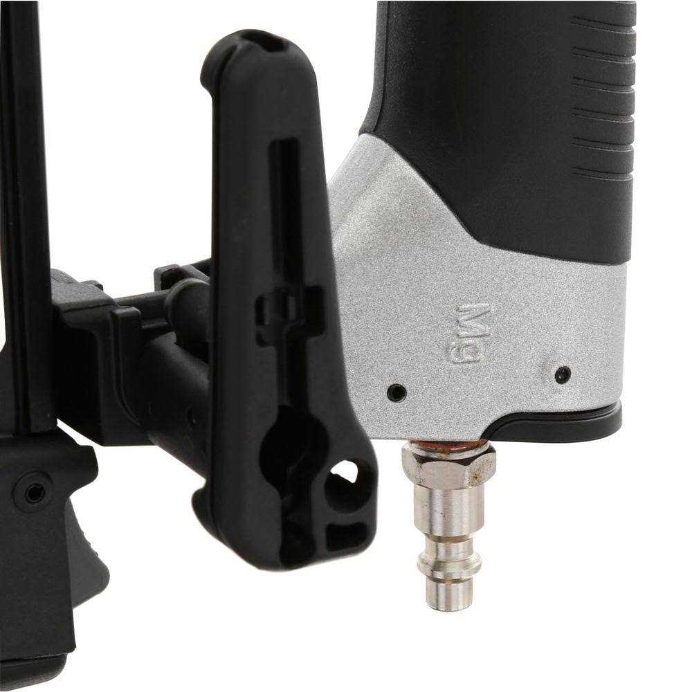 Air Brad Nailer, Collation Type Adhesive, Fastener Range 5/8 – 2 In., 18 Gauge, CFM per Shot 2.83 at 80 psi, Required Pressure 70 psi, Max. Pressure 120 psi, Magazine Capacity 100, Sequential Firing Mode, Rear Exhaust, Nose Tip, Housing Material Magnesium, Gray/Black Color, Length 10-7/16 In., Width 2-5/8 In., Height 9-1/4 In., Tool Weight 2.6 lb., For Use With Finish and Trim, Includes (500) 1-1/4 In. Brad Nails, 1/4 In. Fitting, Carrying Case
